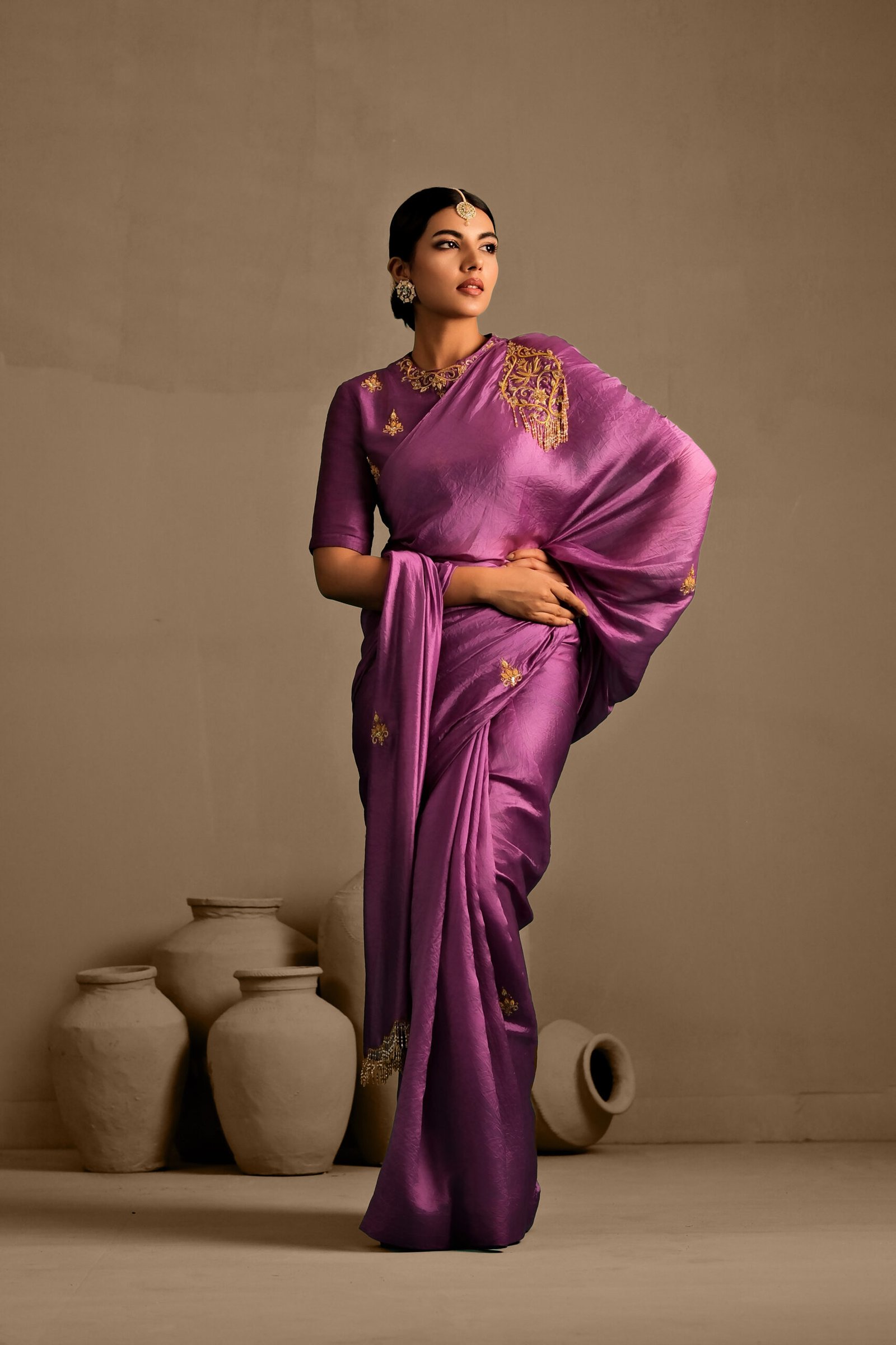 An ode to craftsmanship and color, ISHQ-E-ZARI is a refined pink sari brought to life through intricate zardozi artistry. Crafted in fluid silk, the sari features delicate hand embroidery that unfolds across the pallu and borders, lending richness without excess. The luminous pink tone paired with fine detailing creates a poised yet striking presence, making ISHQ-E-ZARI an elegant choice for celebrations defined by sophistication and style.
