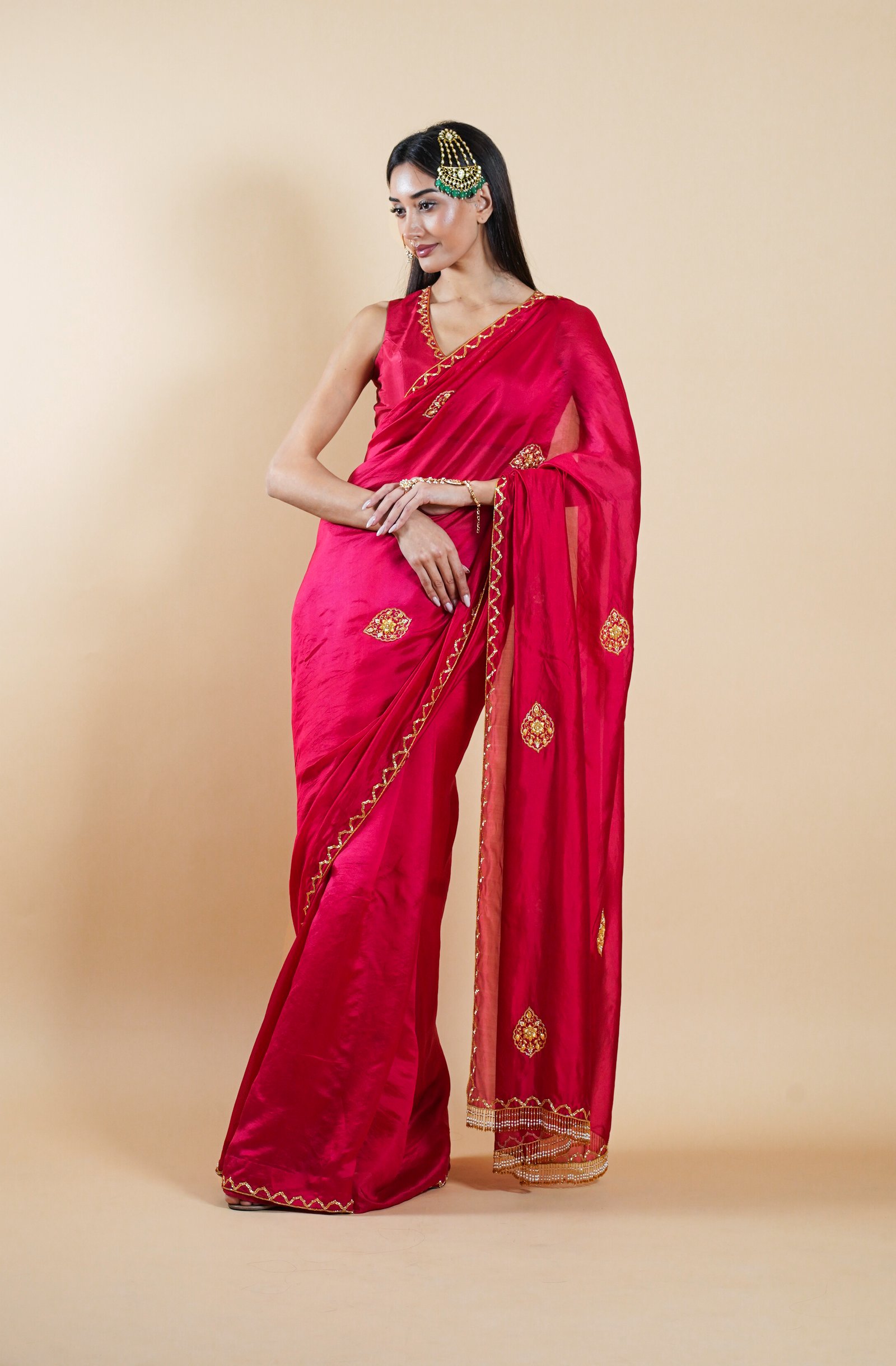 Embrace the regal charm of the night sky with Shaahi Khwab, a royal blue sari that exudes opulence and grandeur. Crafted from weightless organza-silk, it is adorned with exquisite zardozi work. Swarovski crystals are scattered across the sari, mimicking the twinkling stars of a clear night. The rich hue and intricate zardozi detailing on the pallu makes this sari a statement piece, perfect for the grandest of celebrations..