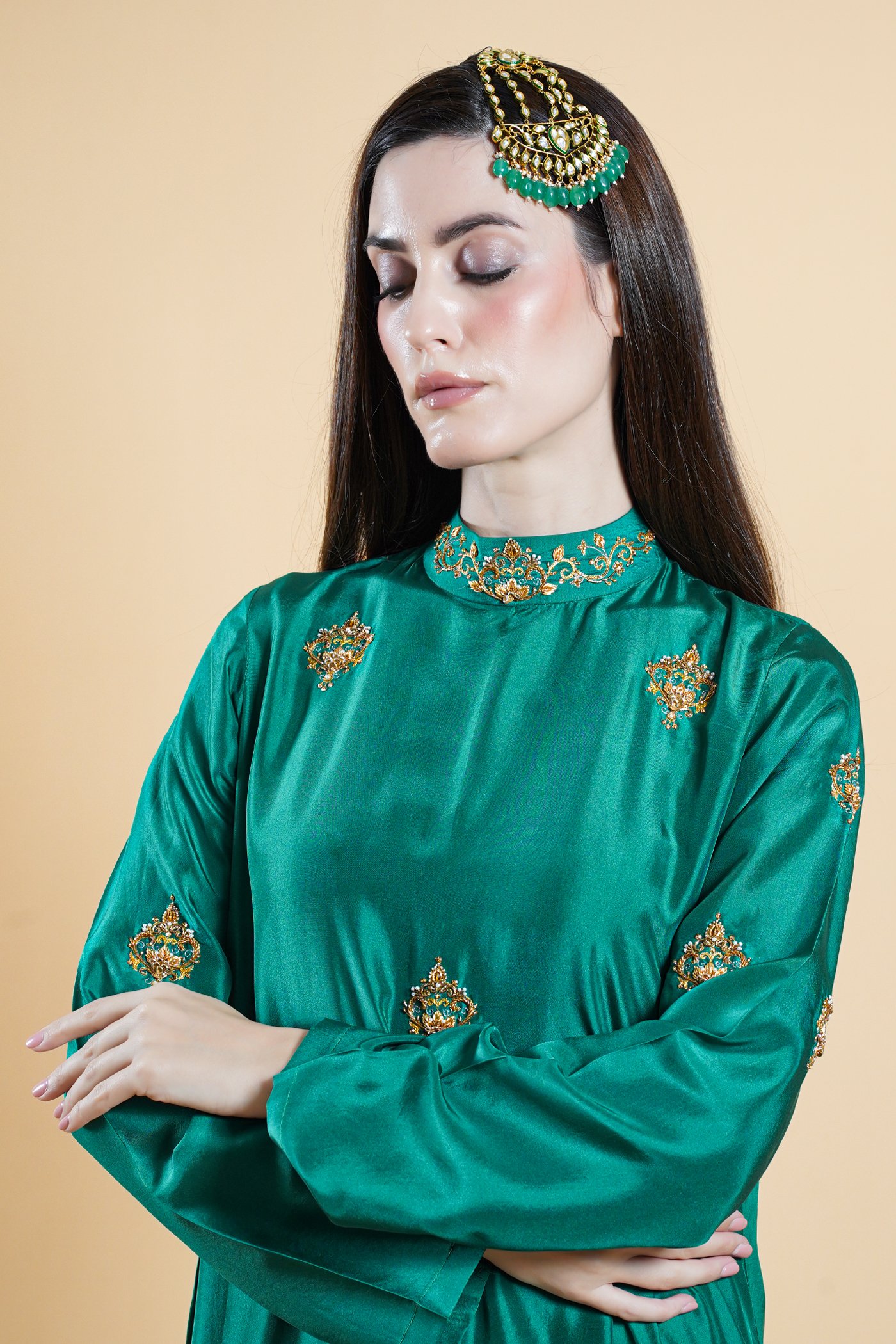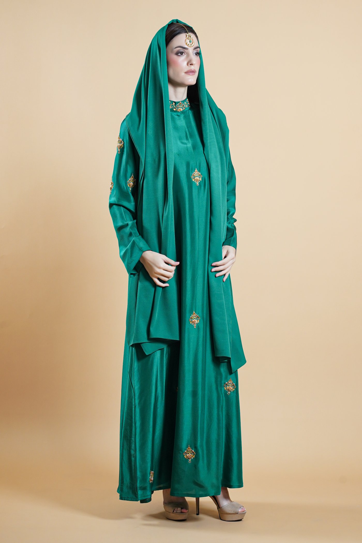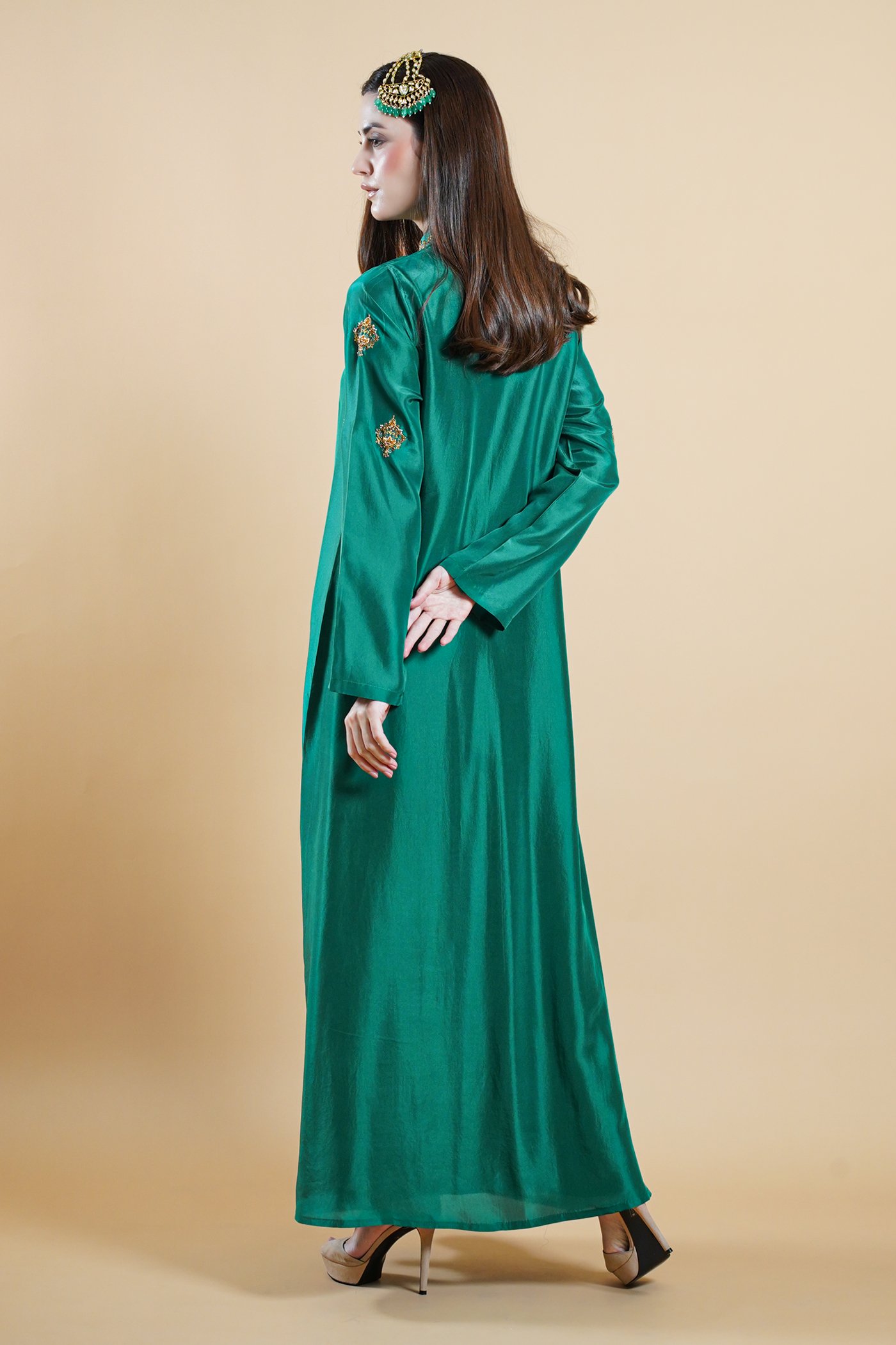 Rooted in the poetry of Mughal elegance, Bano Begaum is an ode to grace shaped by heritage. Crafted in a rich green tone, this kaftan is adorned with intricate handwork carried all over the silhouette, brought to life by skilled artisans whose craft lives through generations. Each detail is placed with care, creating a sense of depth and quiet richness throughout.Â