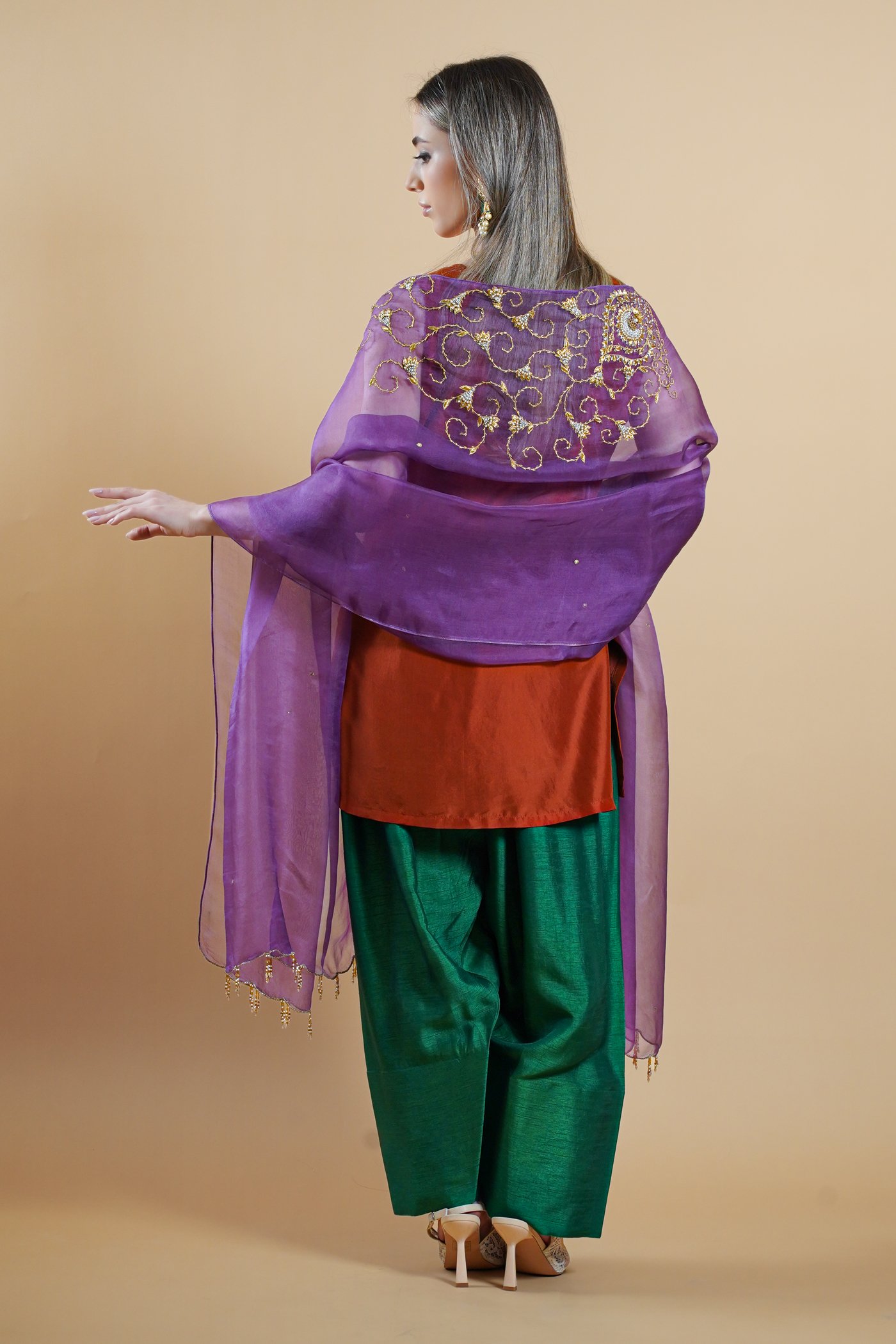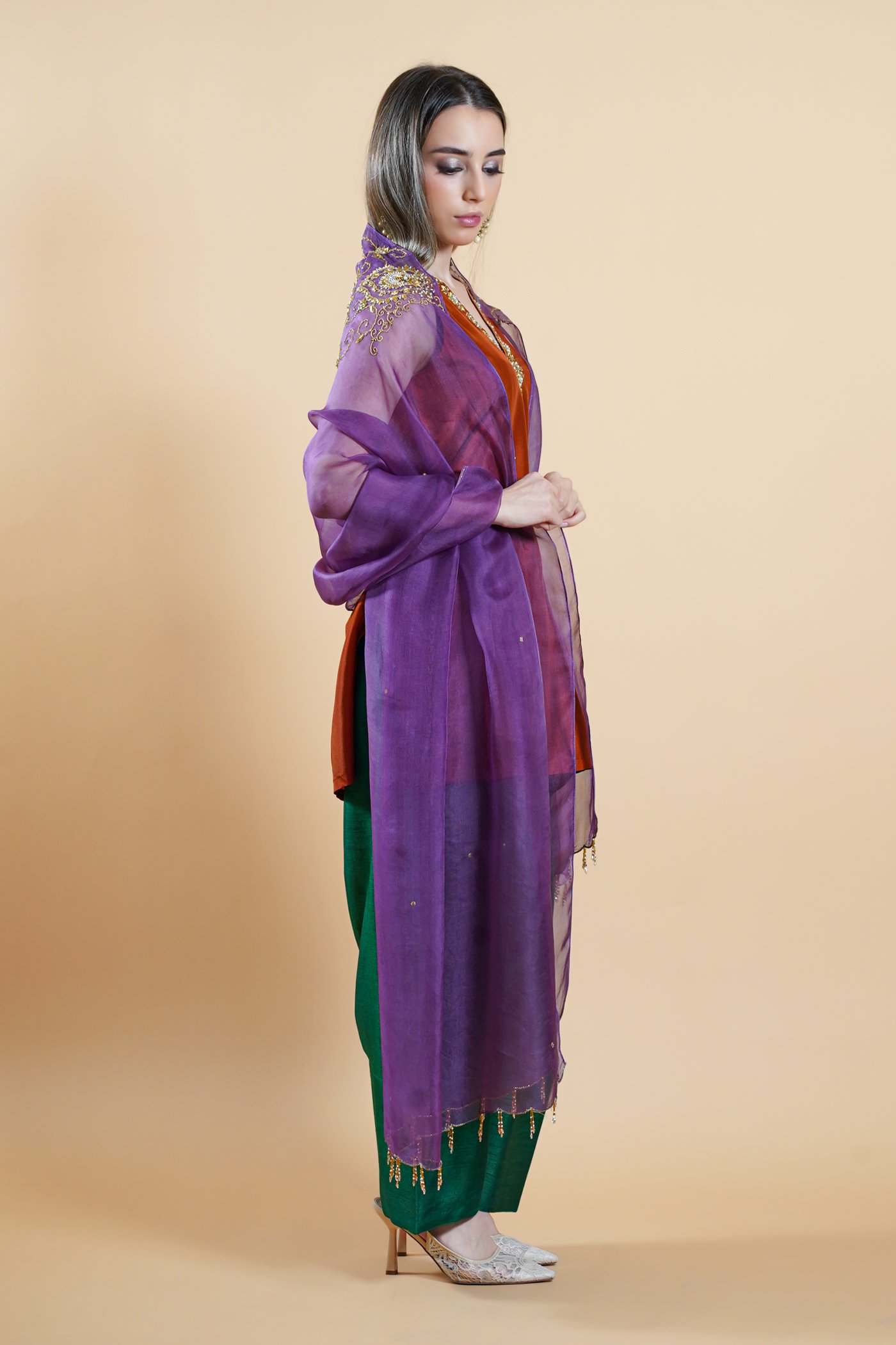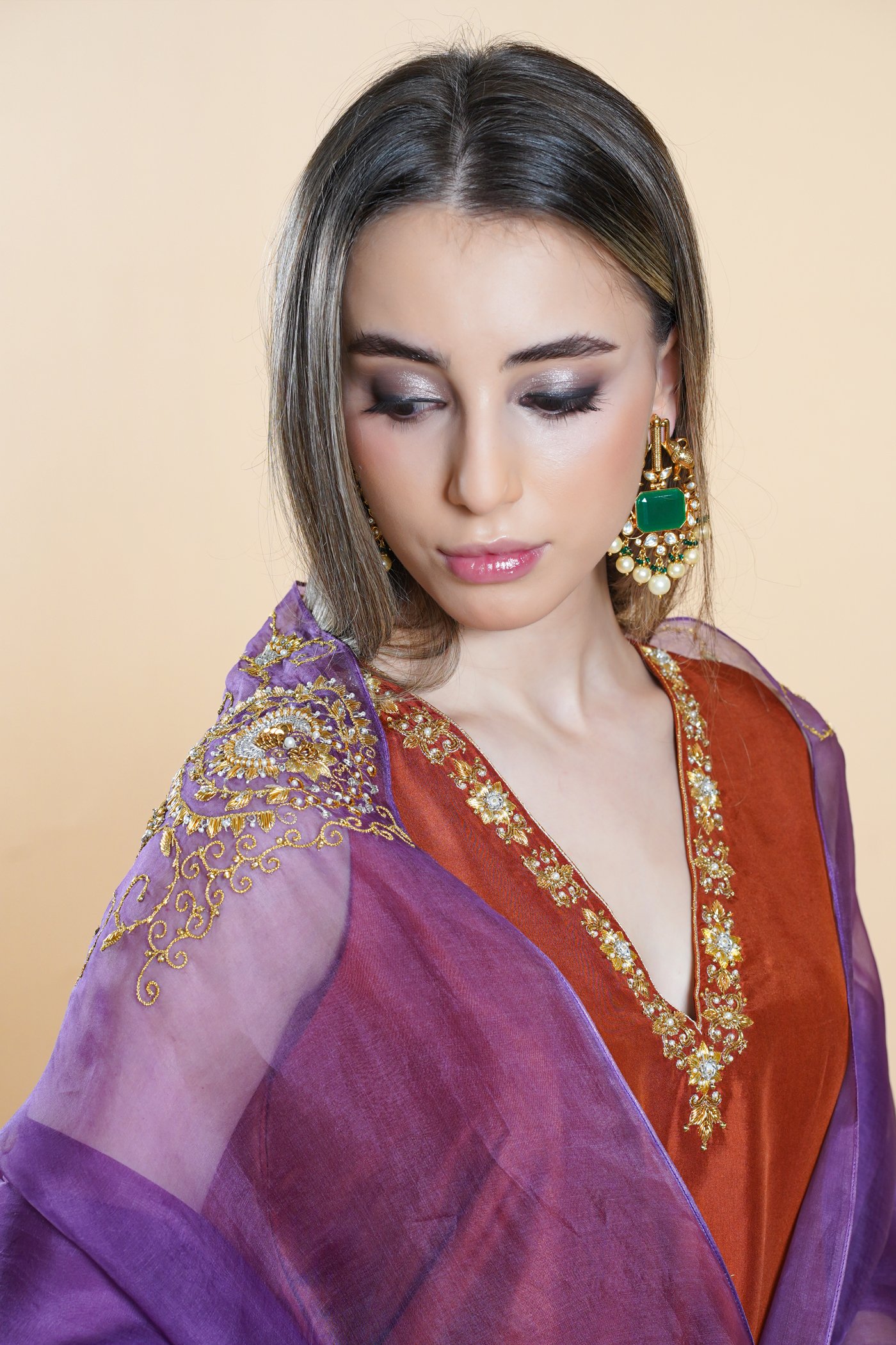 Paired with a raw silk farzi salwar, the look is completed with a purple dupatta adorned with delicate motif and ghumer work, bringing movement and contrast to the ensemble. Thoughtfully composed, Gul-e-Khas brings tradition into a modern expression, standing as a piece of artistry rather than a passing moment. Gul-e-Khas is not simply worn.Â