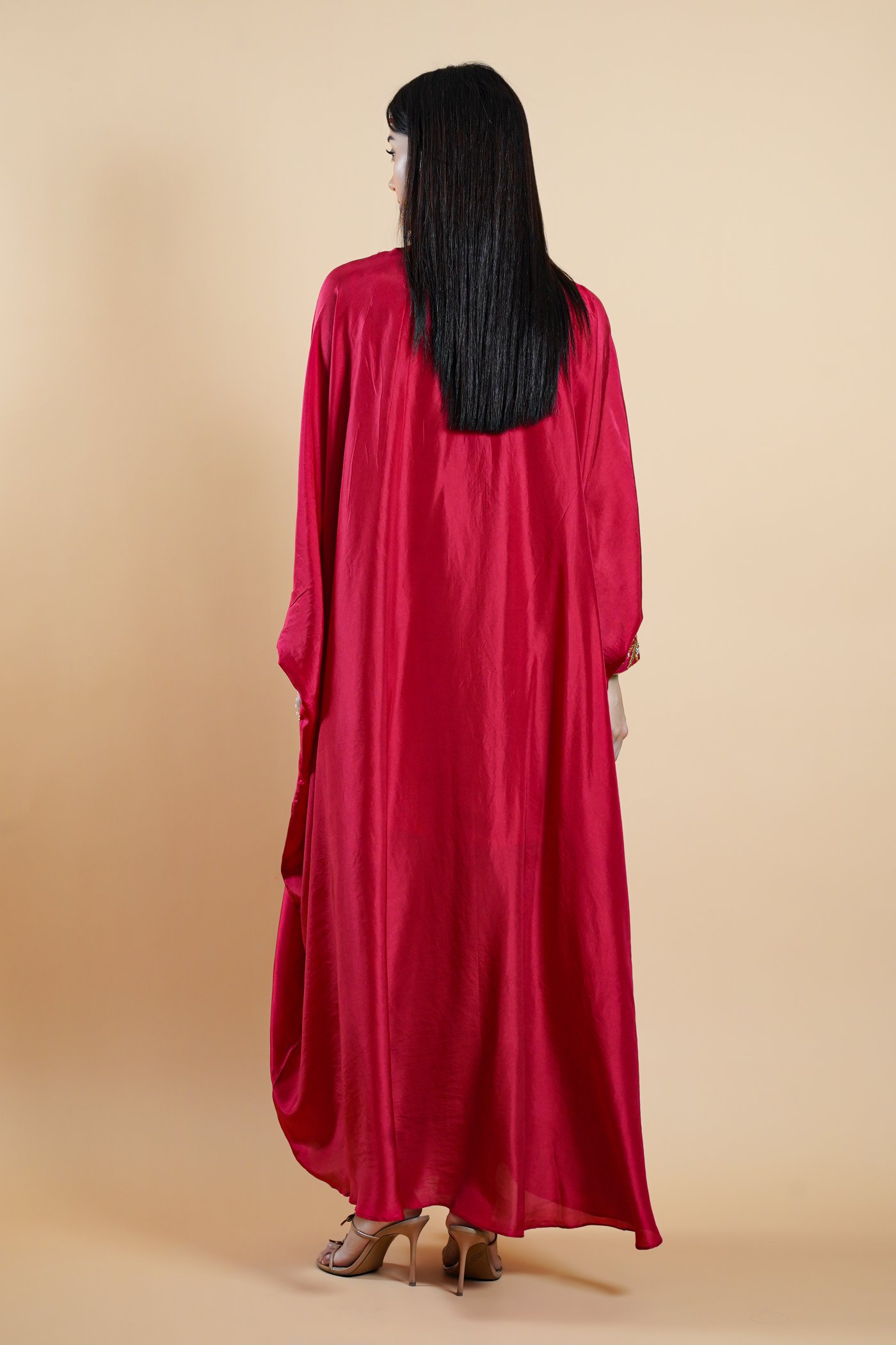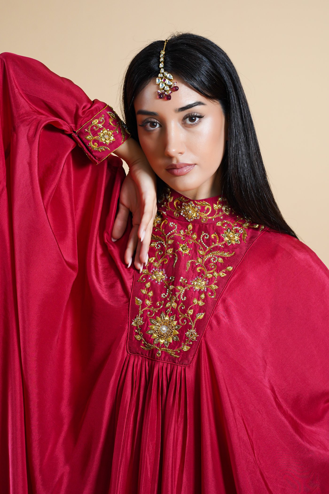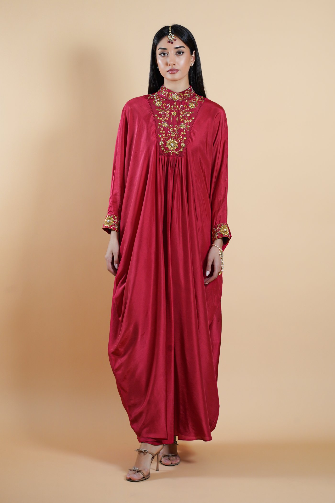 Rooted in the poetry of Mughal elegance, Gulbadan reflects warmth shaped by skilled craftsmanship. Crafted in a rich red hue, this kaftan drapes fluidly, forming a silhouette that feels graceful and poised. The collared neckline is detailed with intricate handwork, echoed through embroidery placed near the chest, creating a strong yet balanced focal point.Â