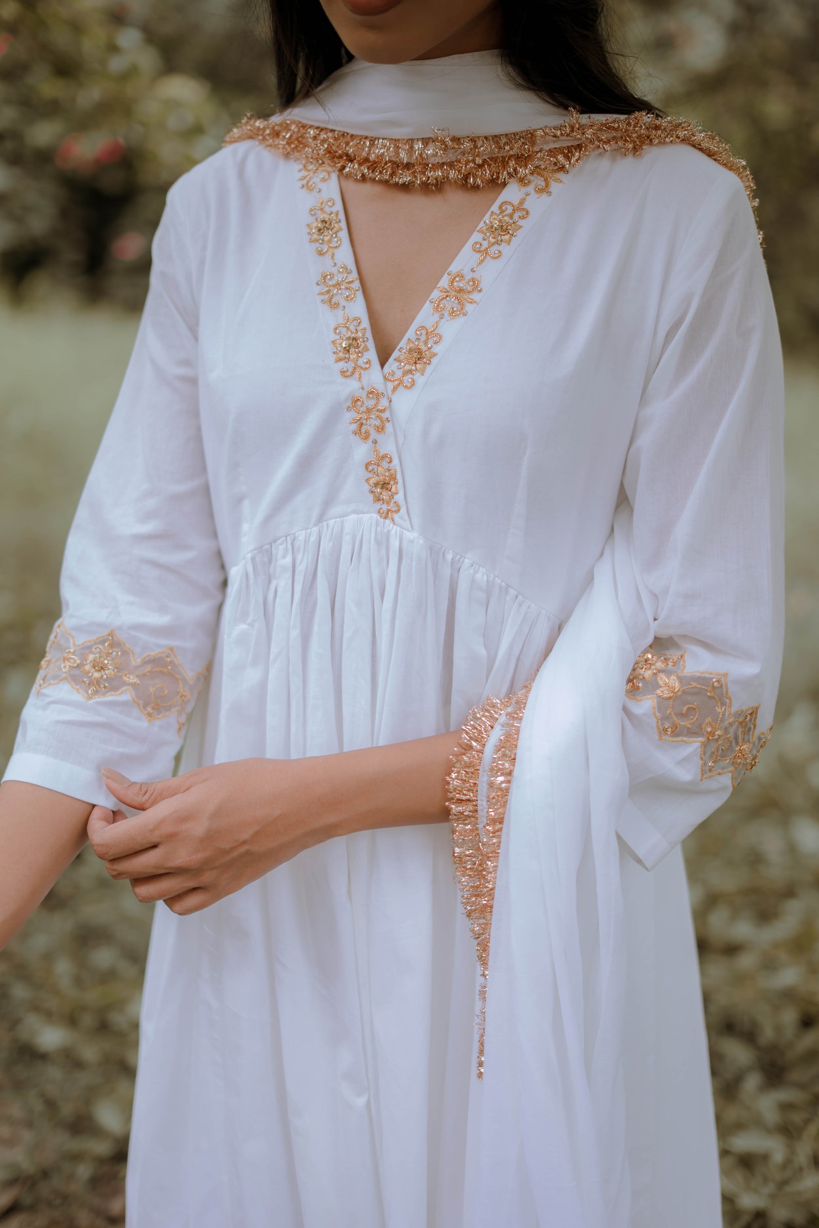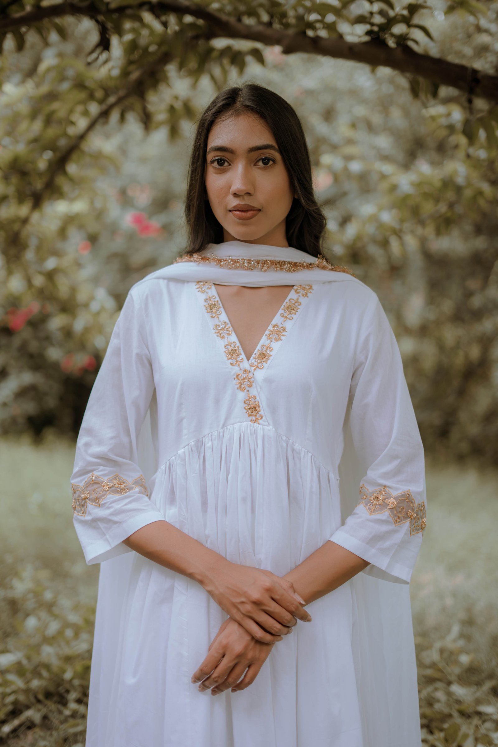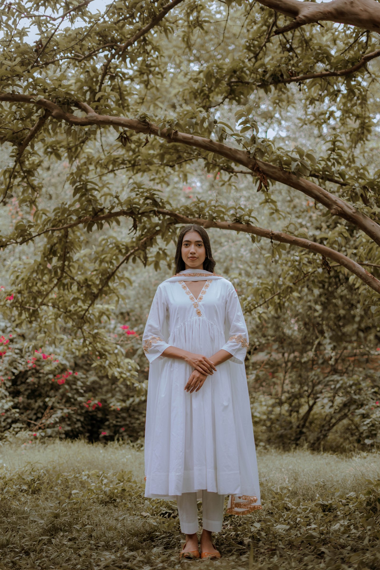 Hoor is a whisper of summer light, airy, and perfect for warm days and golden hours. The kurta is gently embroidered with delicate zari work along the neckline, cuffs, and sleeves, adding a touch of quiet elegance. It’s paired with a weightless cotton dupatta, finished with premium Badla lace detailing. Hoor is made for moments of stillness, slow living, and the quiet beauty found in simplicity.