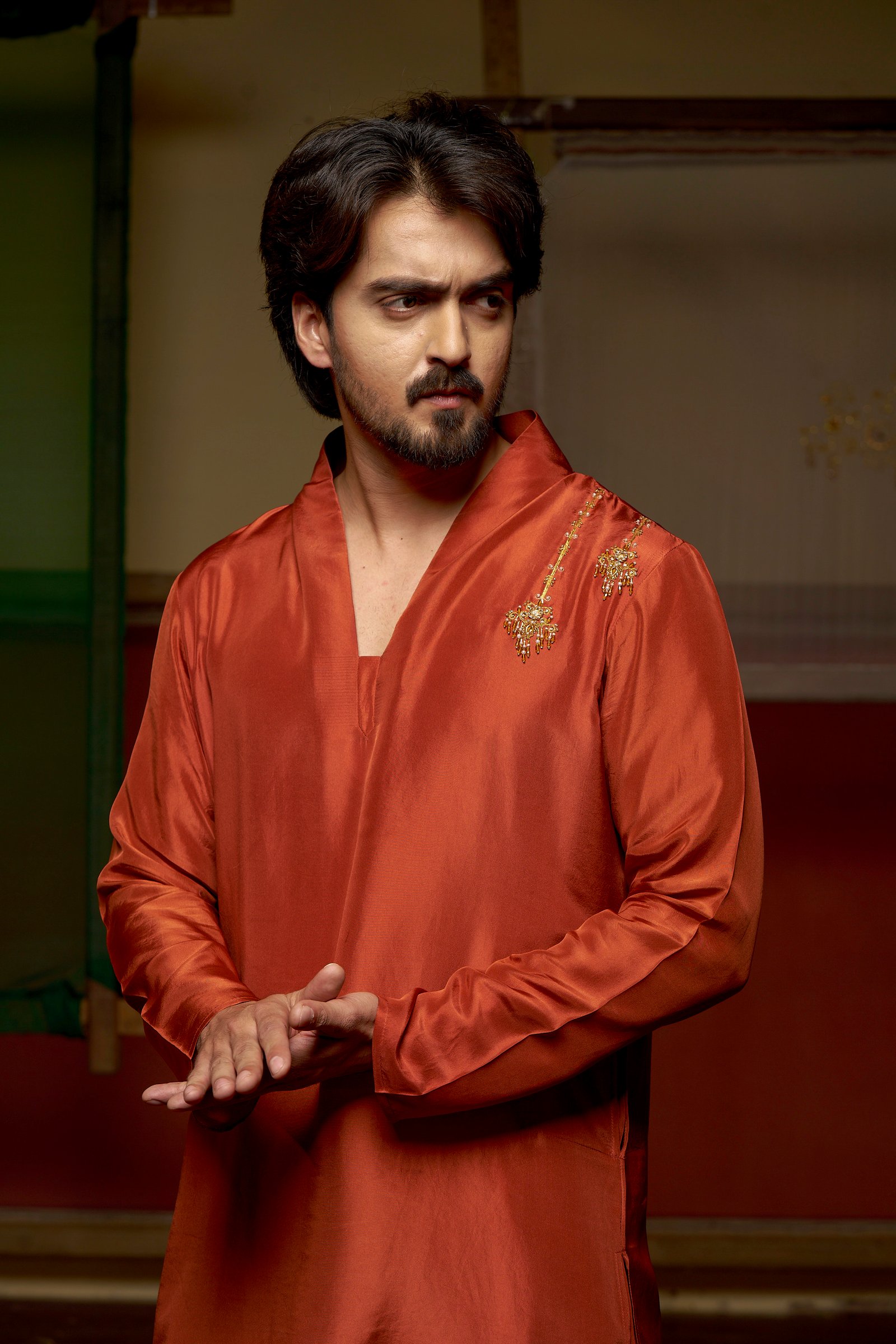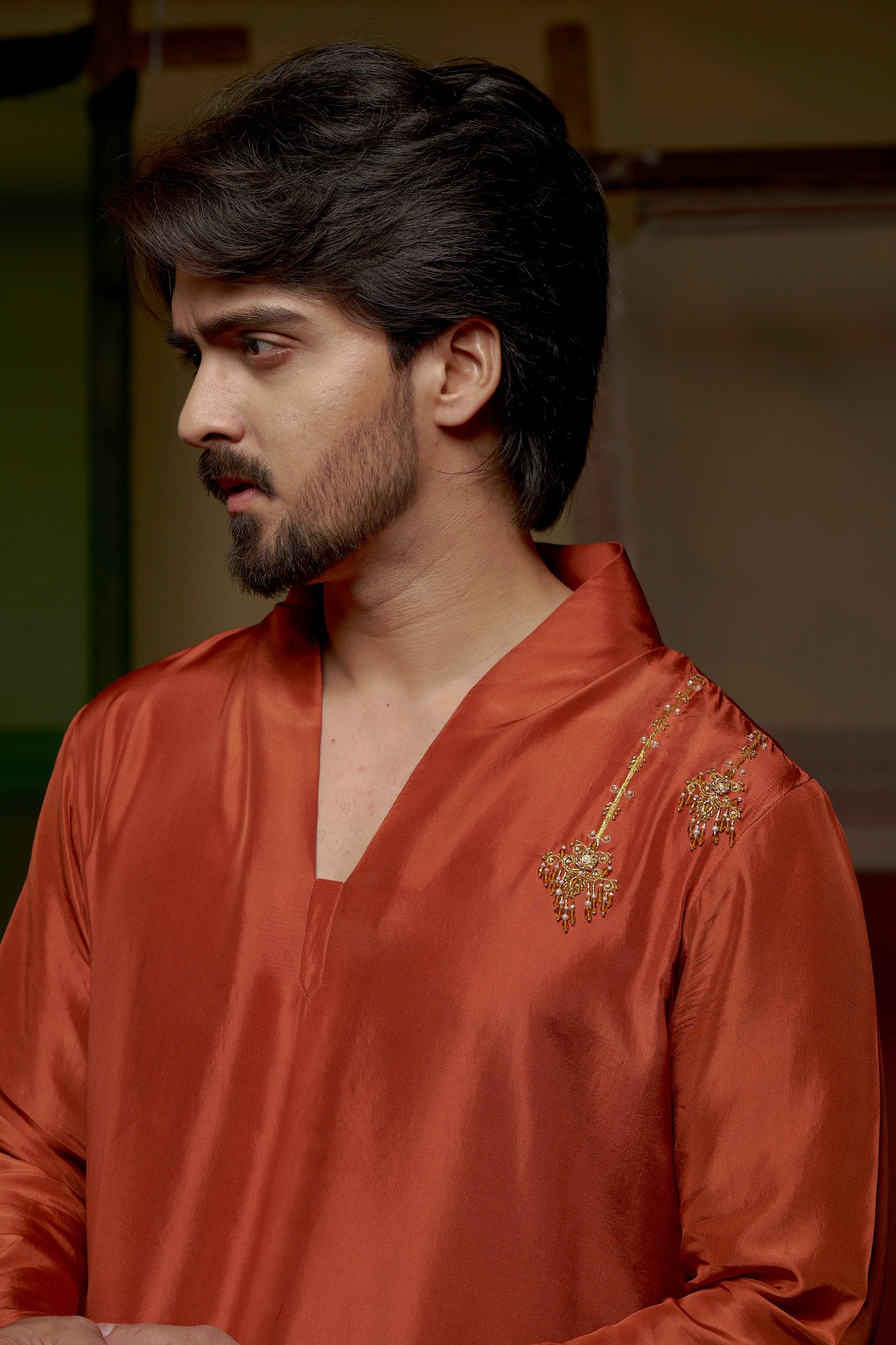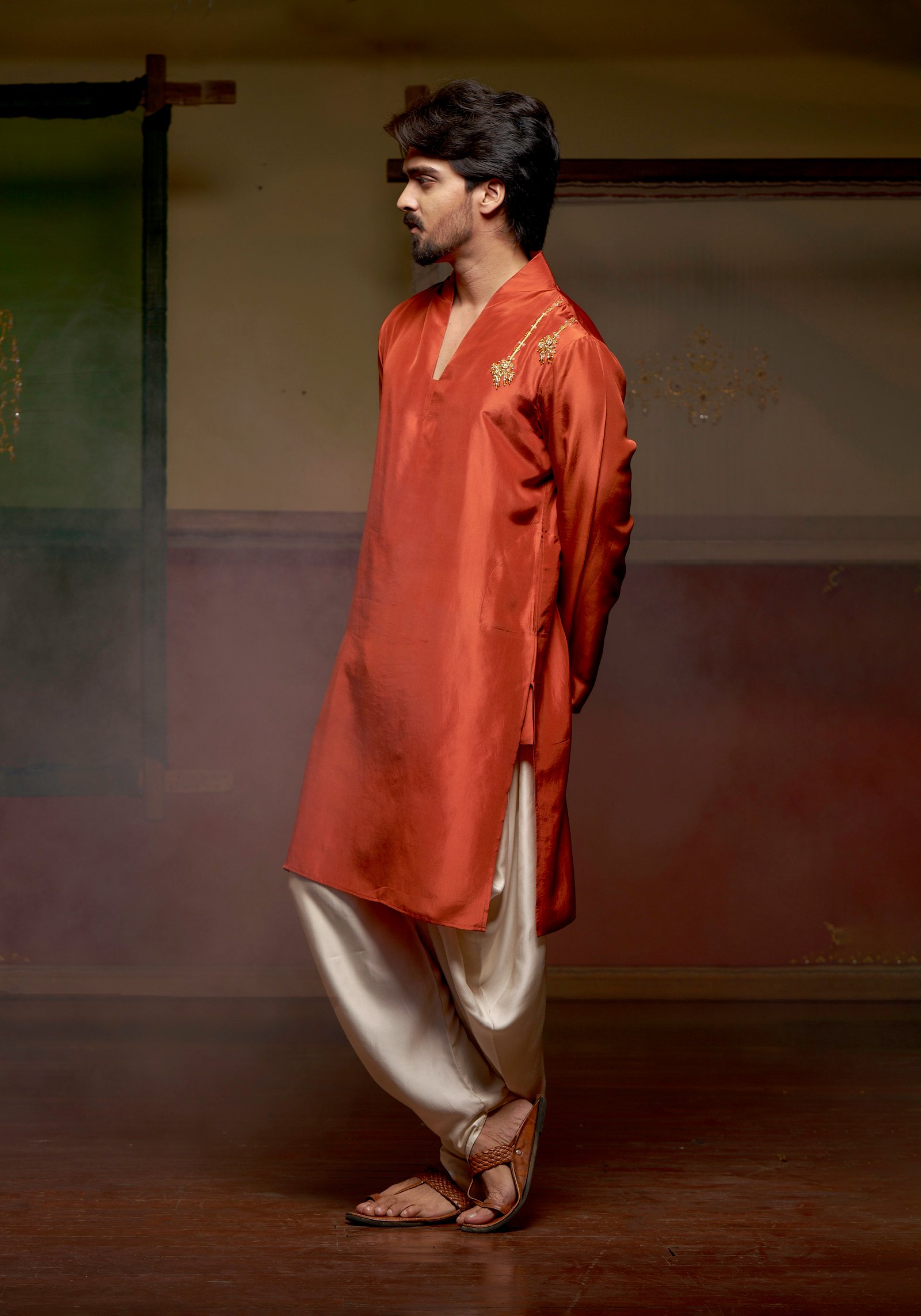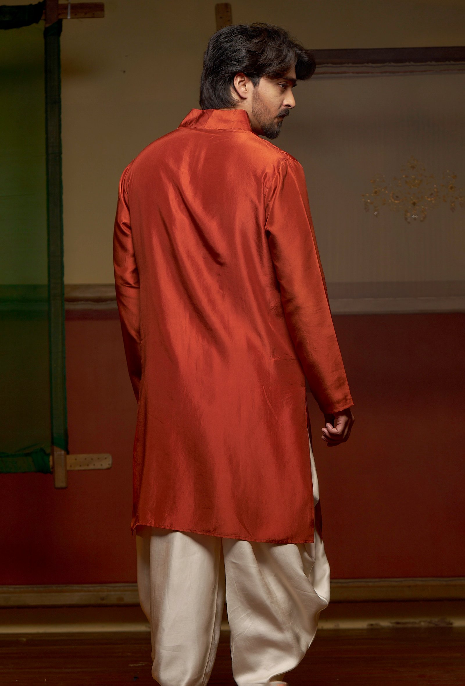 Rooted in the poetry of Mughal elegance, Jahangir reflects classic menswear with a rich, grounded appeal. Crafted in a chestnut-toned kurta paired with a beige slub satin dhoti, this ensemble carries a warm presence shaped by tradition.