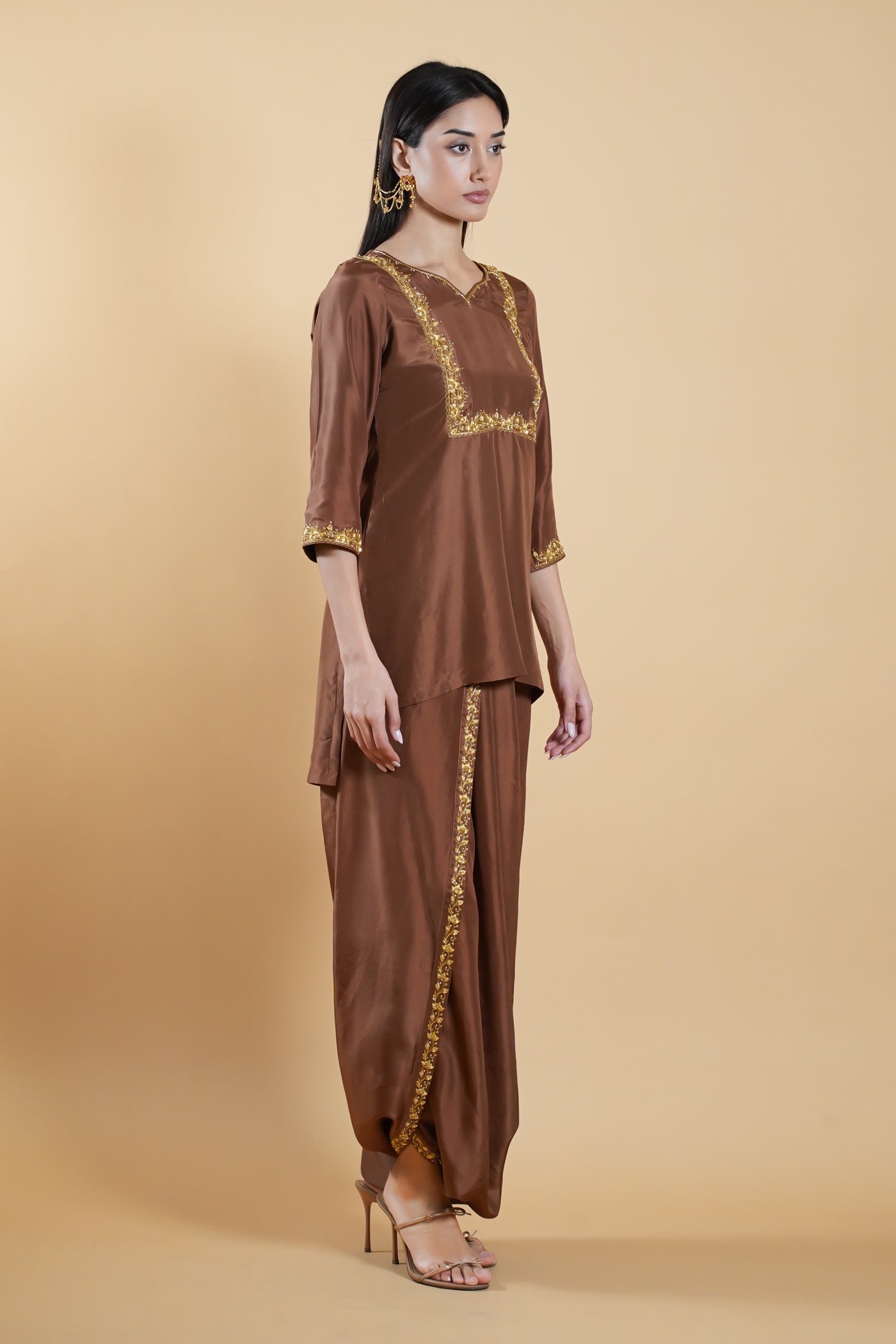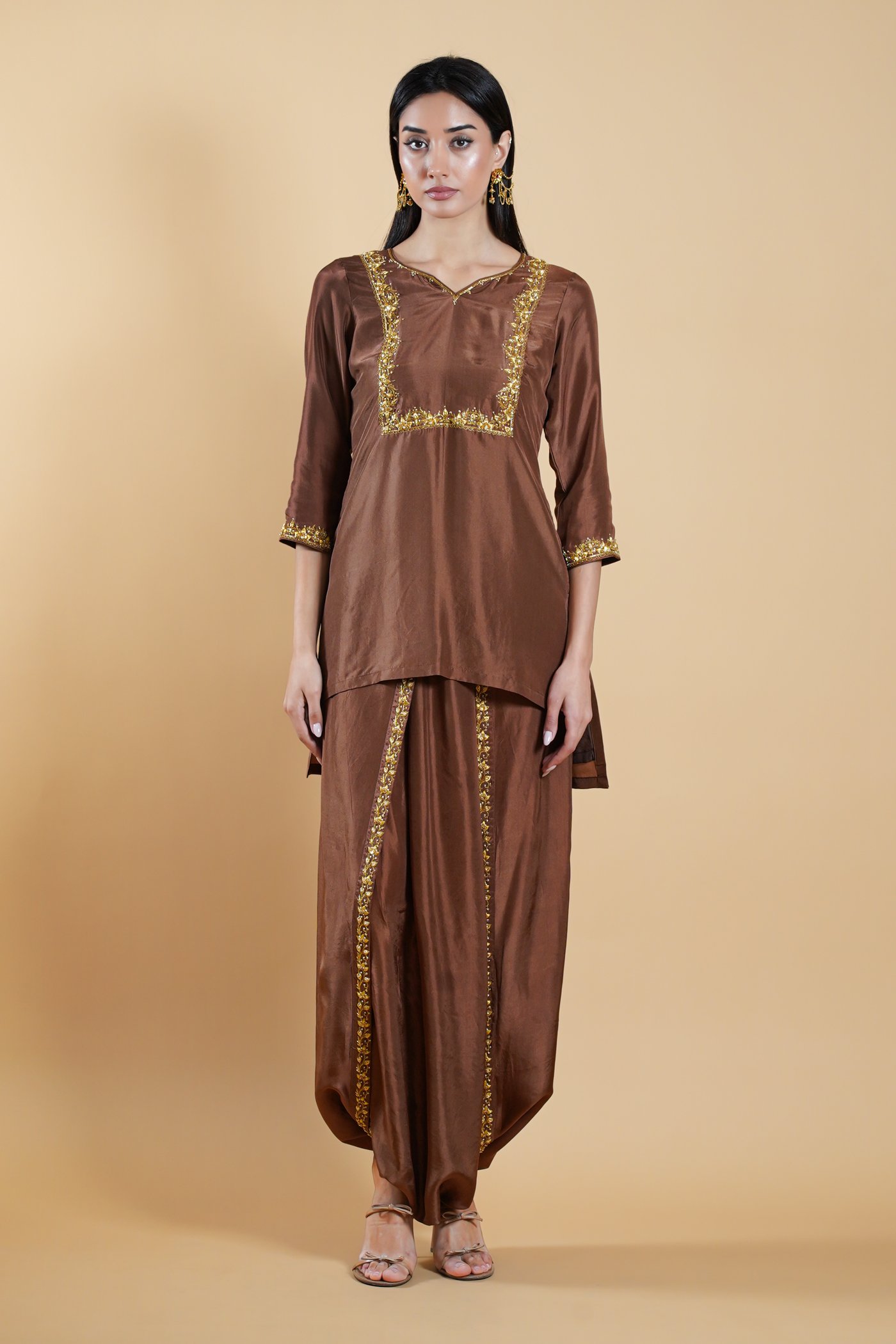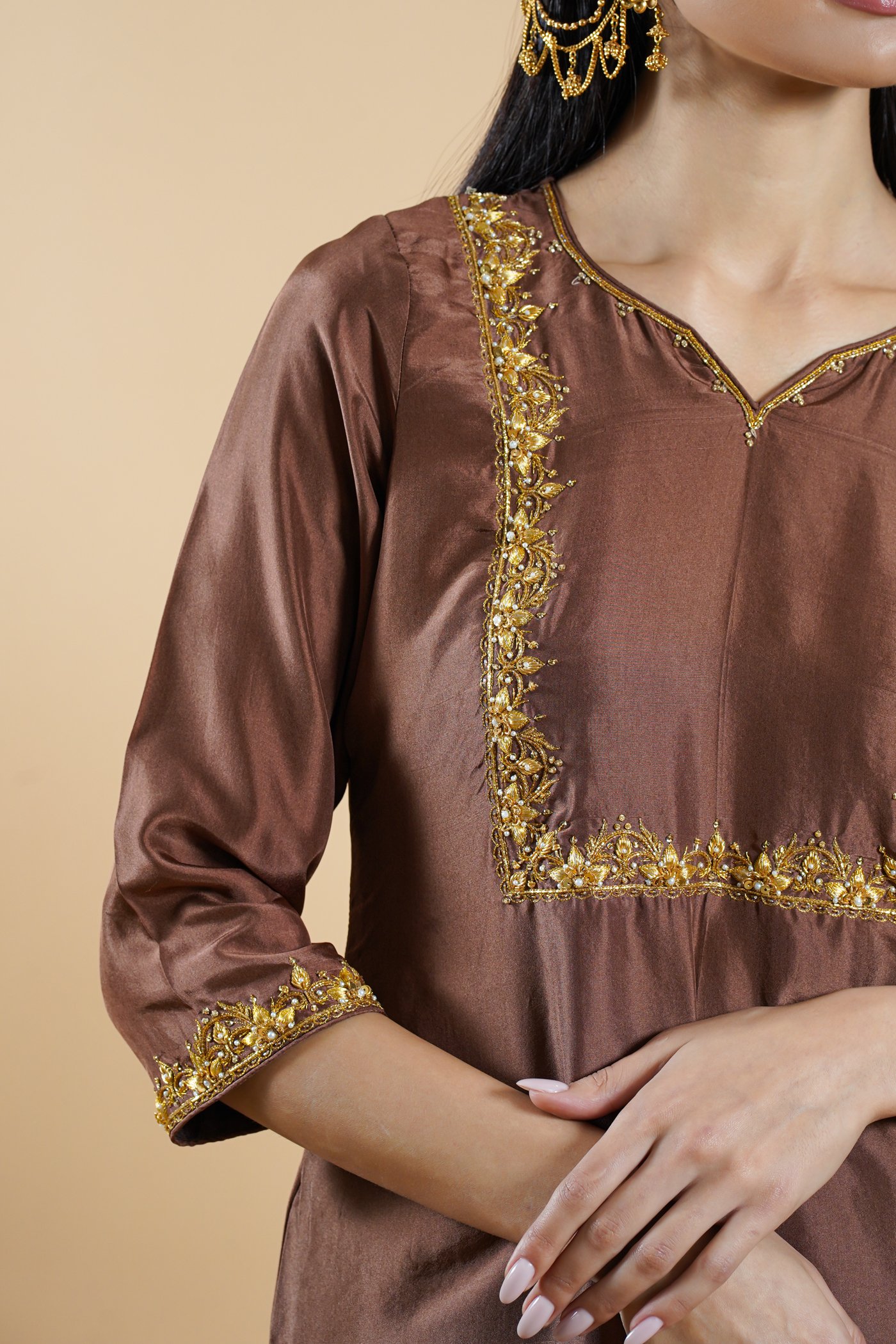 Rooted in the poetry of Mughal elegance, Khayal-e-Zari is an ode to artistry shaped by thoughtful craftsmanship. Crafted in a deep chocolate tone, the short kurta features a balanced silhouette with quarter-length sleeves and a softly neckline. Distinct square-pattern handwork highlights the design, lending structure and quiet richness to the piece.Â