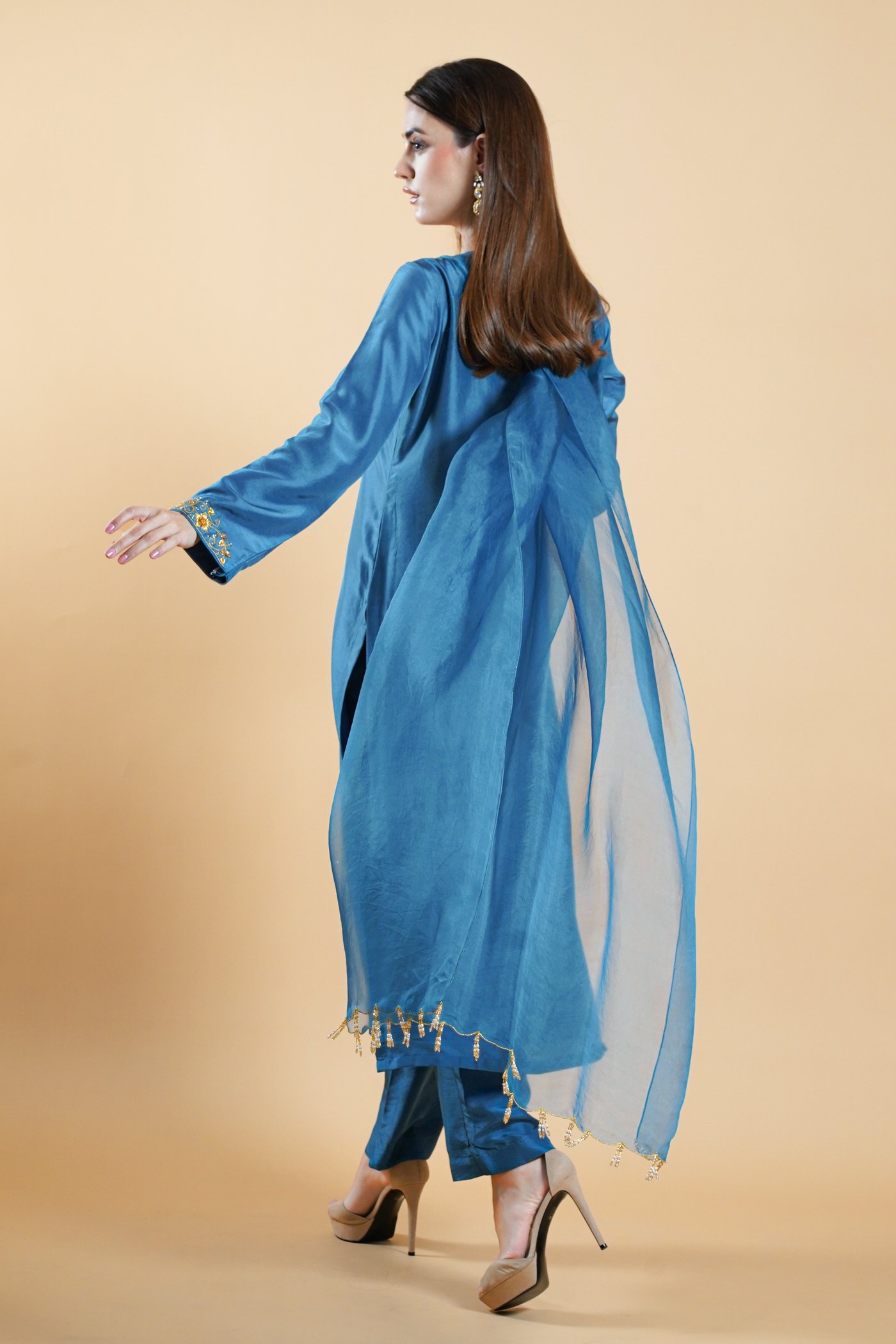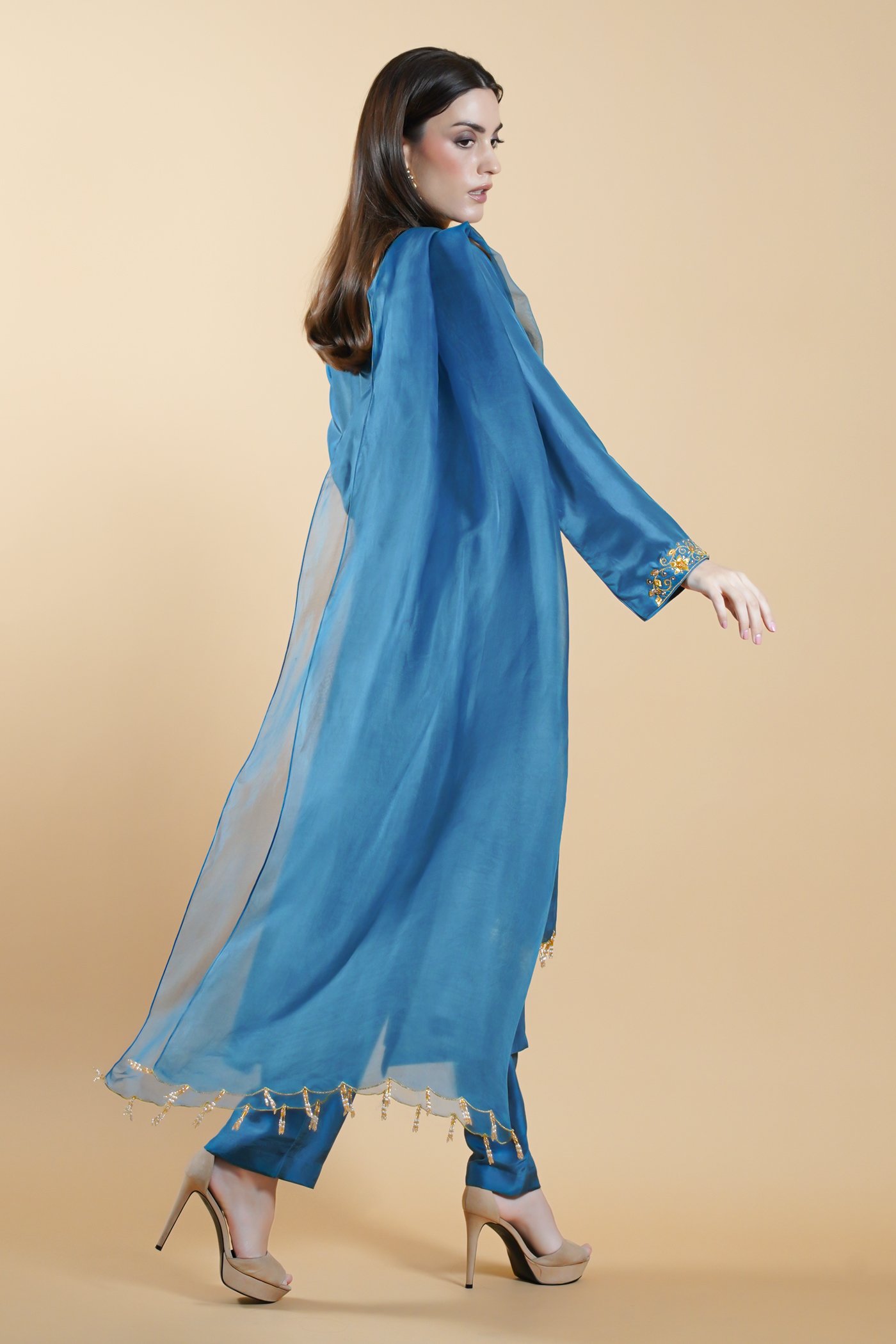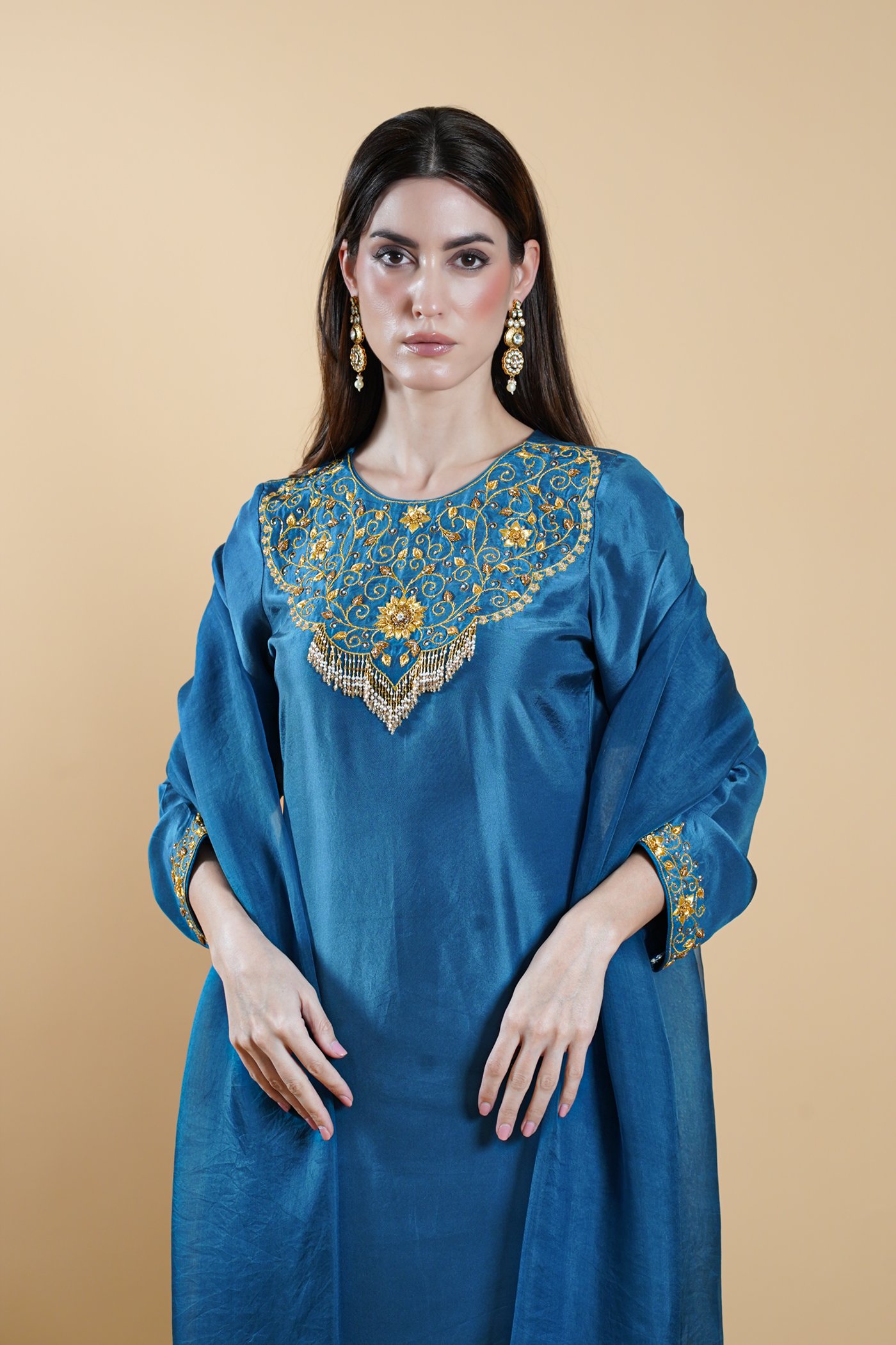 Rooted in the poetry of Mughal elegance, Noor-e-Zewar reflects a quiet glow shaped by fine craftsmanship. Crafted in a rich peacock hue, the kurta features a clean, straight silhouette paired with matching straight pants for a seamless look. The rounded neckline is detailed with delicate handwork placed near the neck, adding depth with understated charm.