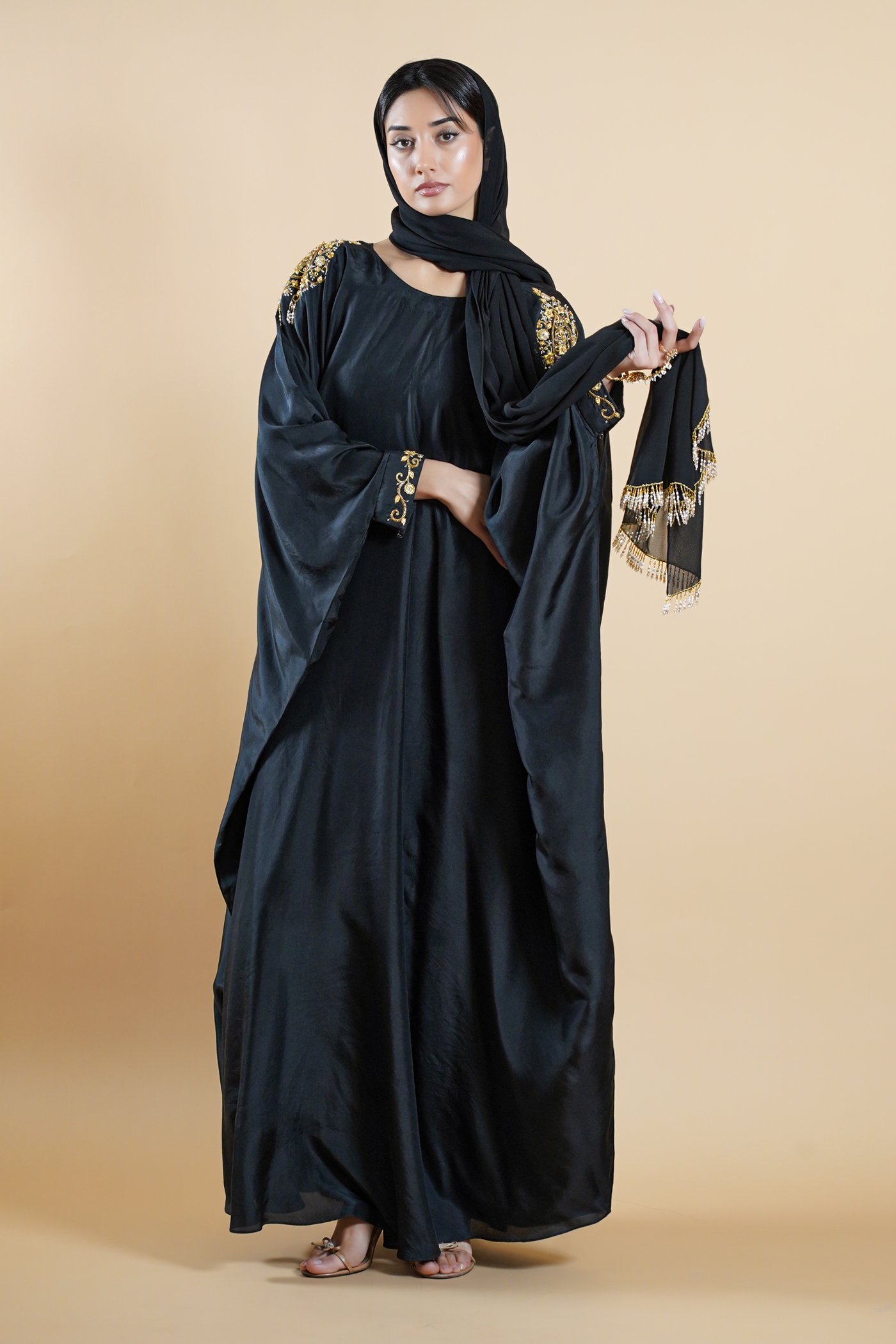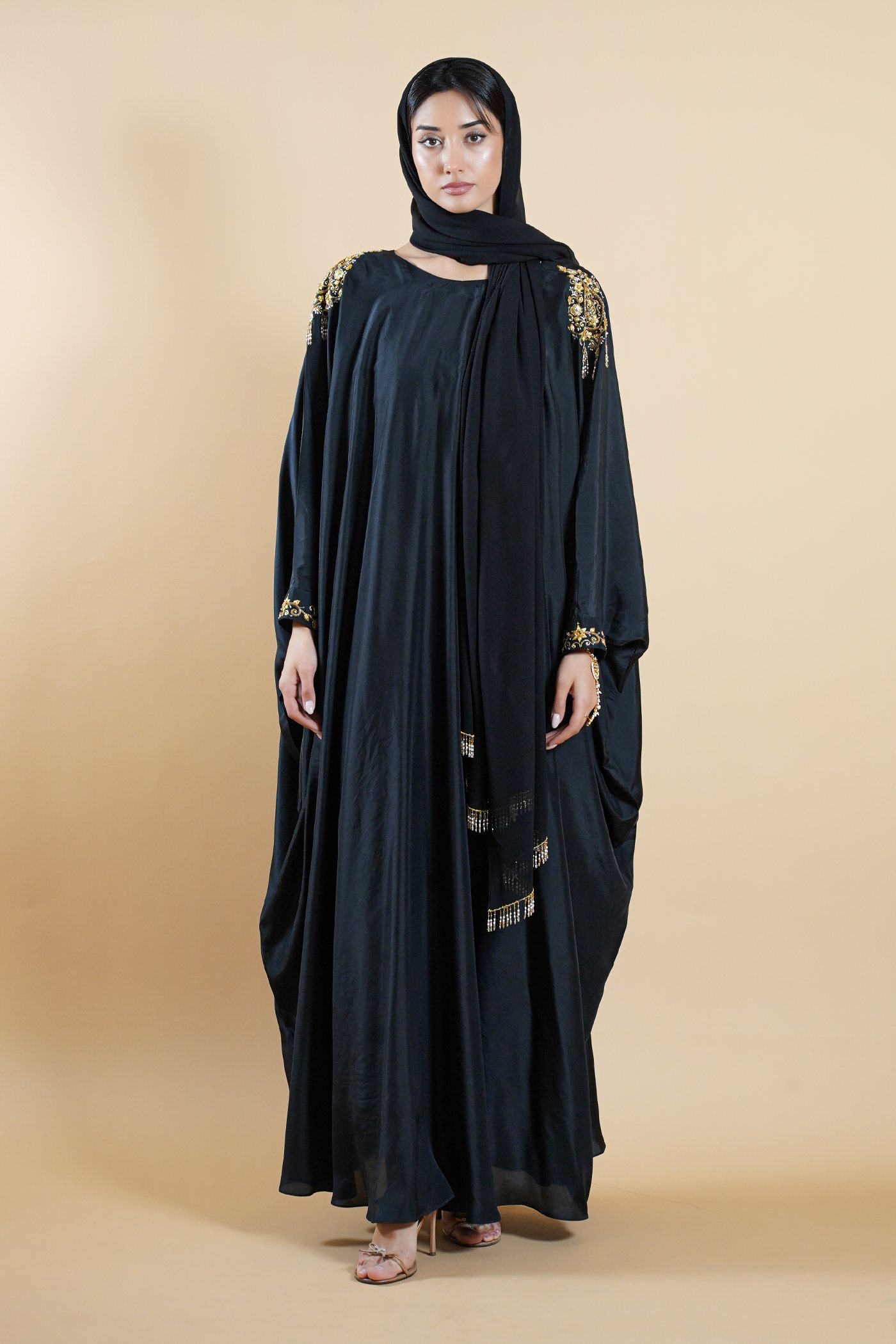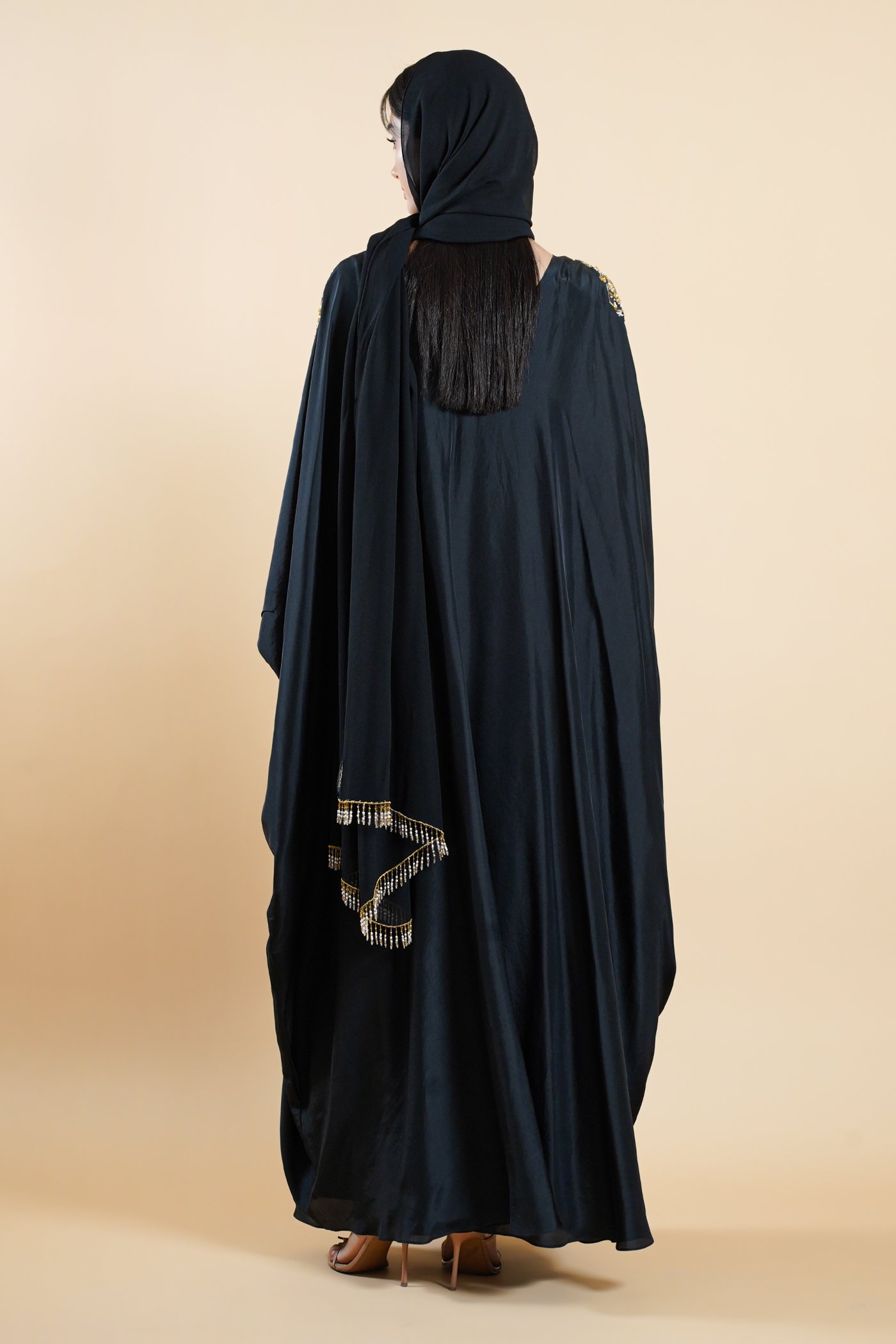Rooted in the poetry of Mughal elegance, Noorjahan reflects softness shaped by skilled craftsmanship. Crafted in a deep black hue, this kaftan drapes fluidly, creating a silhouette that feels graceful and composed. The boat neckline is framed with intricate handwork placed on both shoulders, defining the design with refined detail.Â
