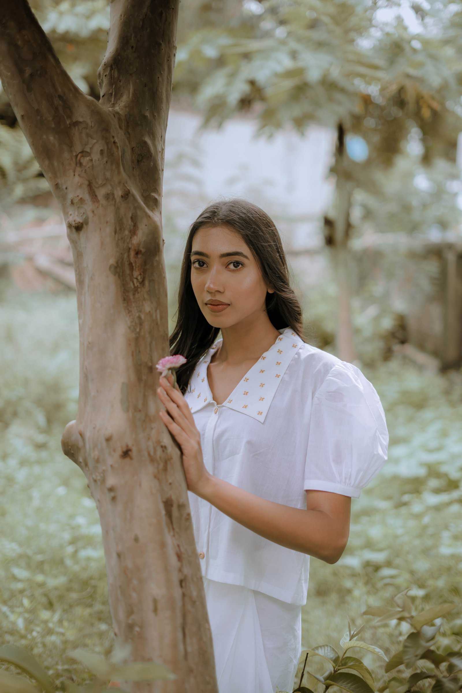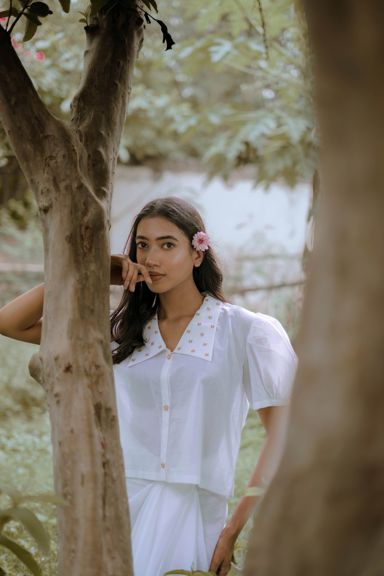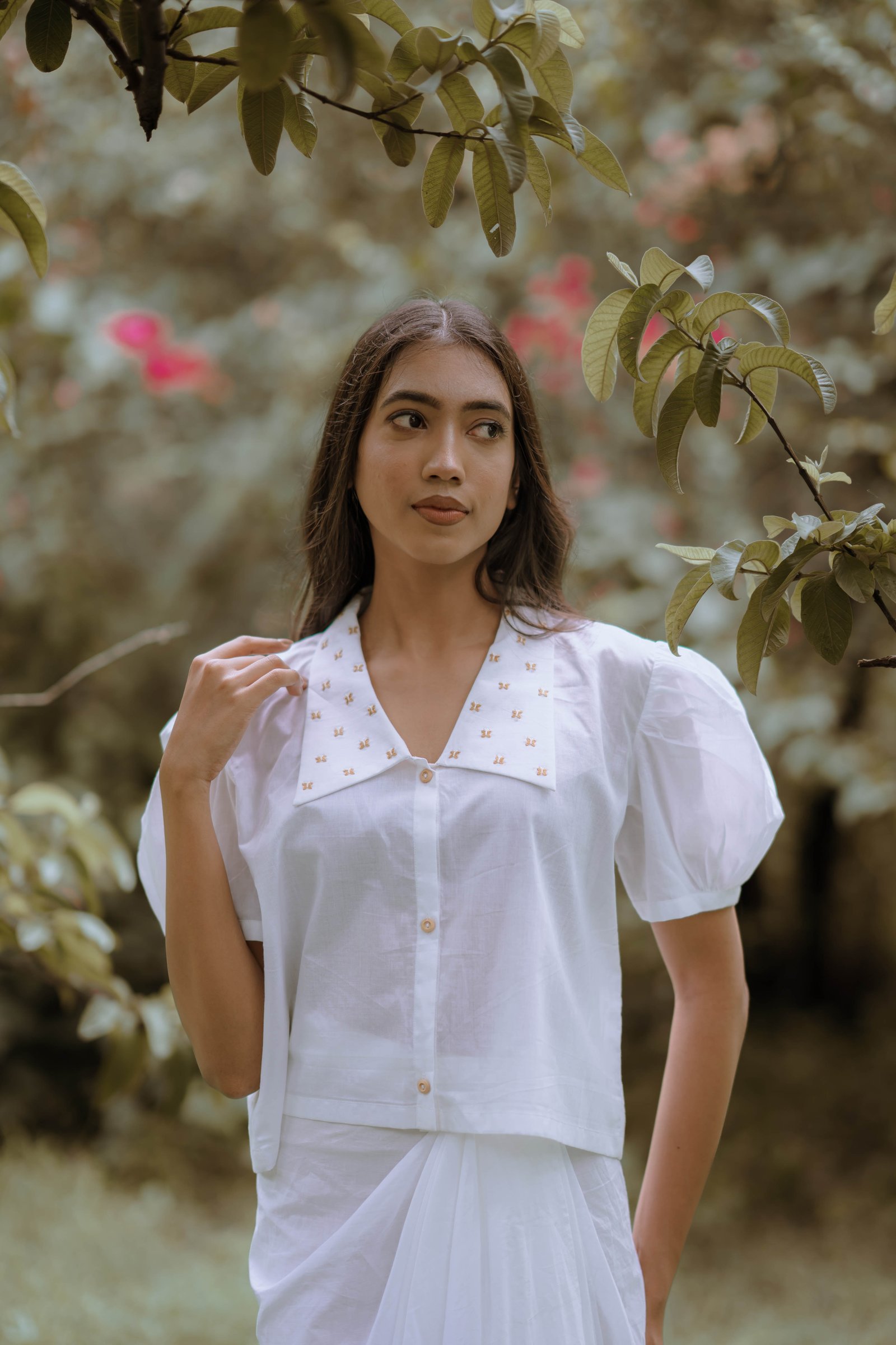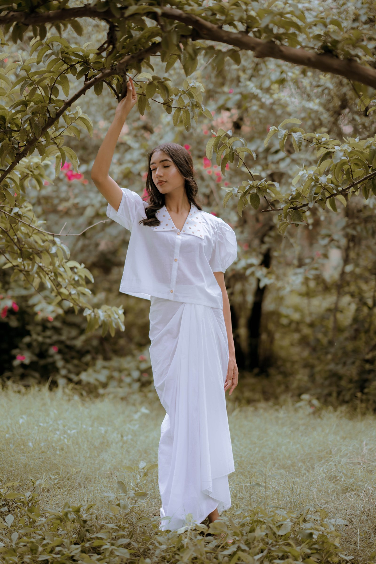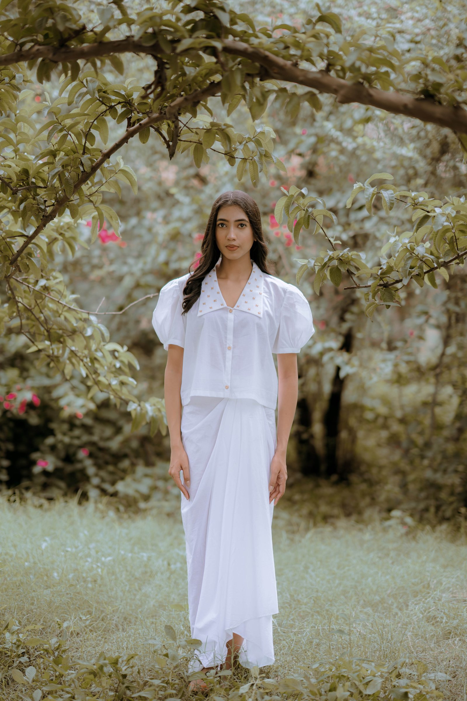 Sabaa a summer story full of charm soft balloon Sleeves, delicate The subtle embroidery work adds just enough to make it special without doing too much. Made from breathable fabric, it’s perfect for warm days, slow evenings, and everything in between. Collar detailing and a flowy dhoti – style skirt that move with you.