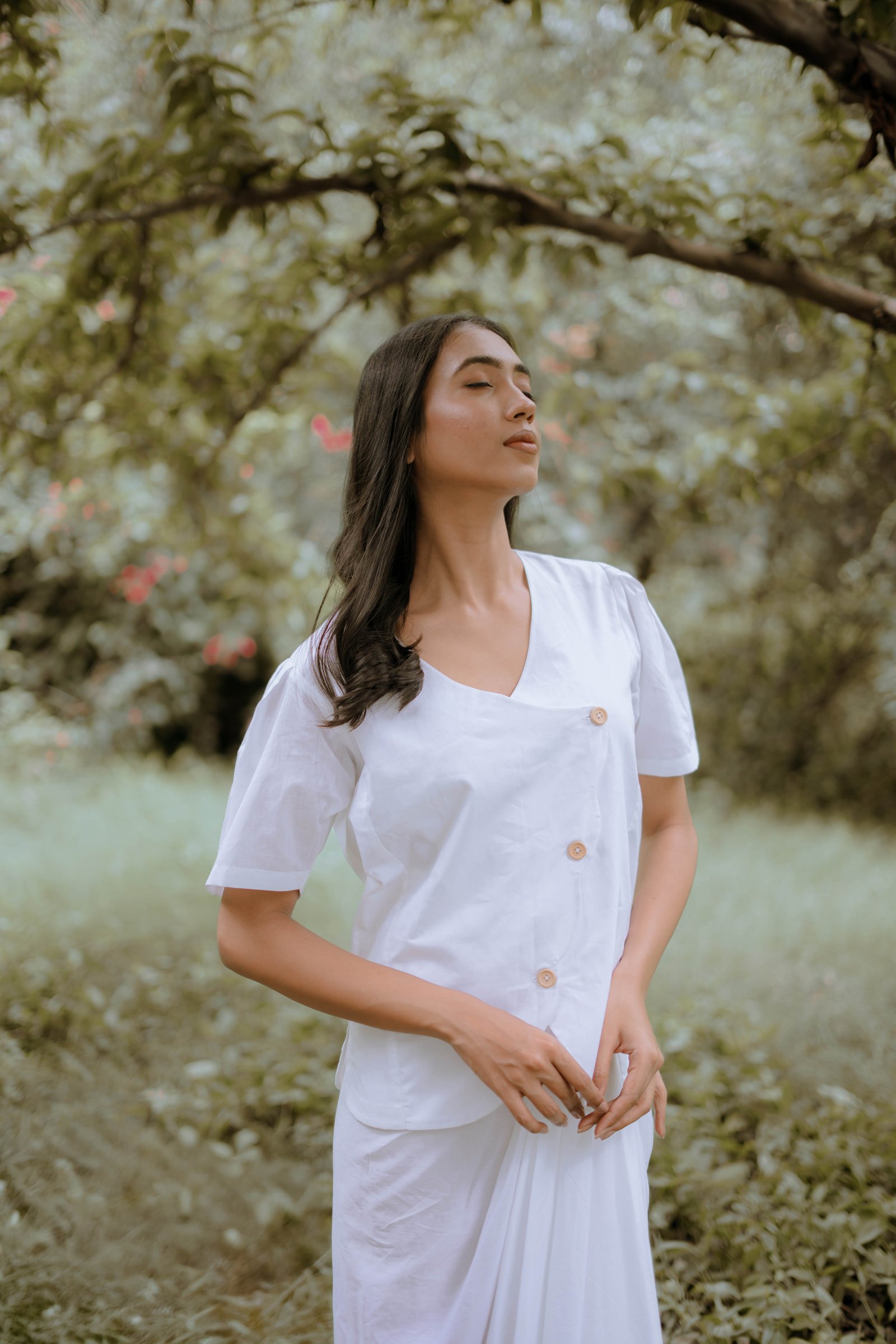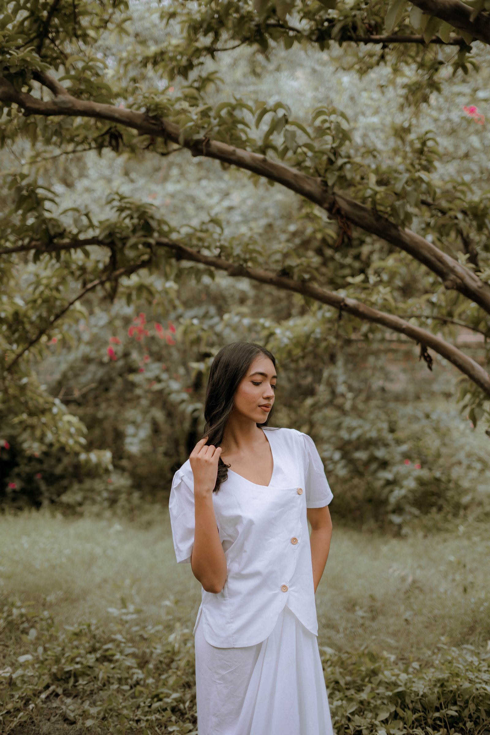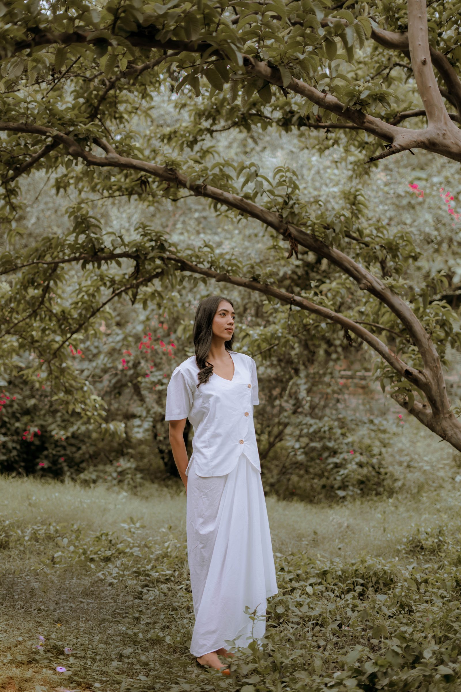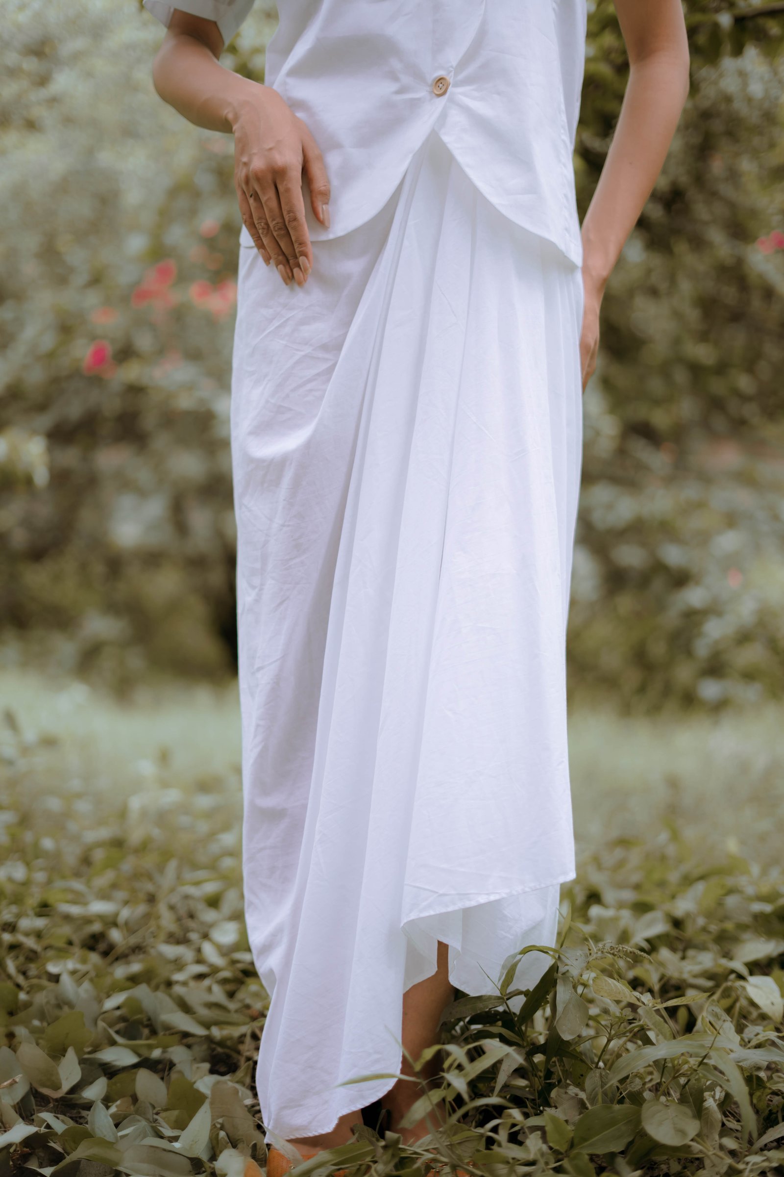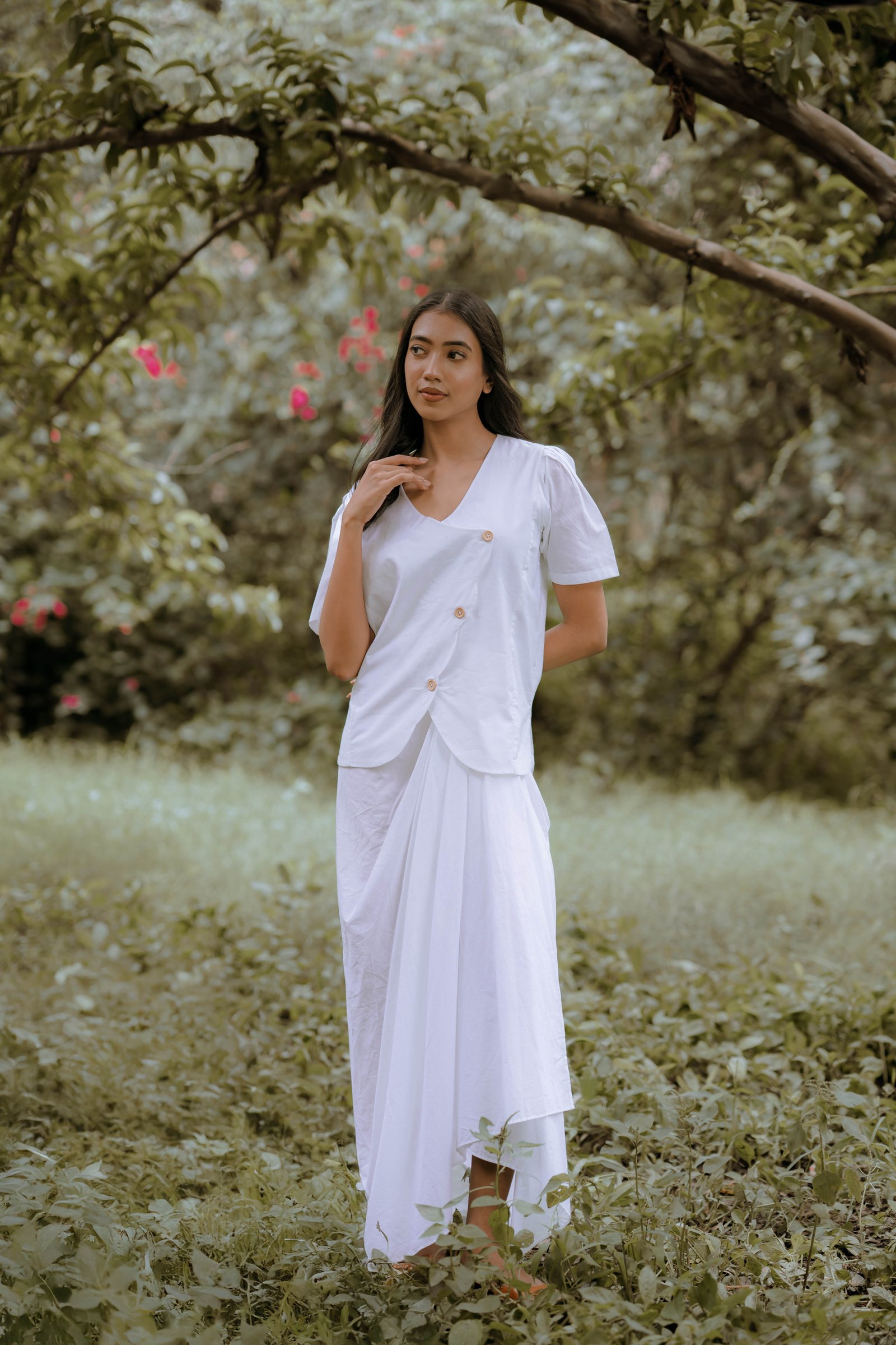 Sahar Softness that flows, strength that stays. Designed with half sleeves and minimal button detailing, this set embraces movement with a gentle silhouette. The dhoti-style skirt adds rhythm to every step ideal for sunlit hours and quiet summer nights. An easy blend of comfort and quiet sophistication.