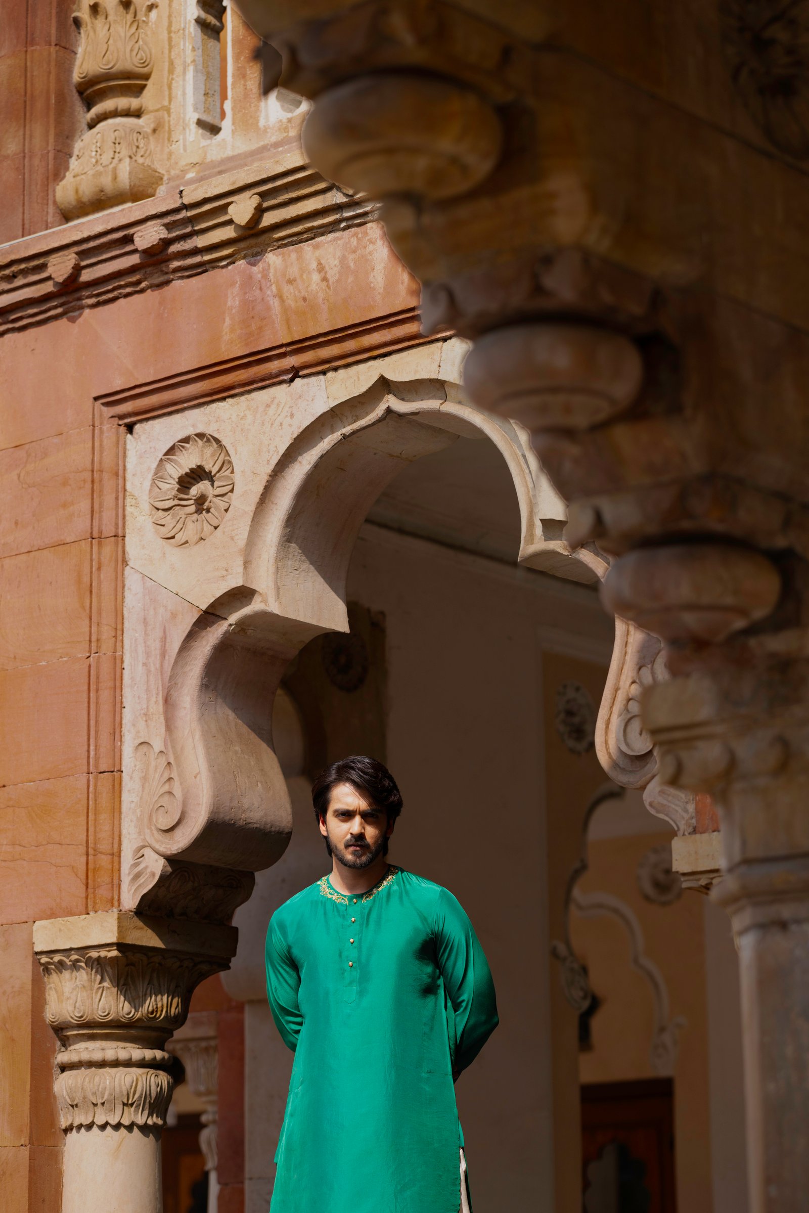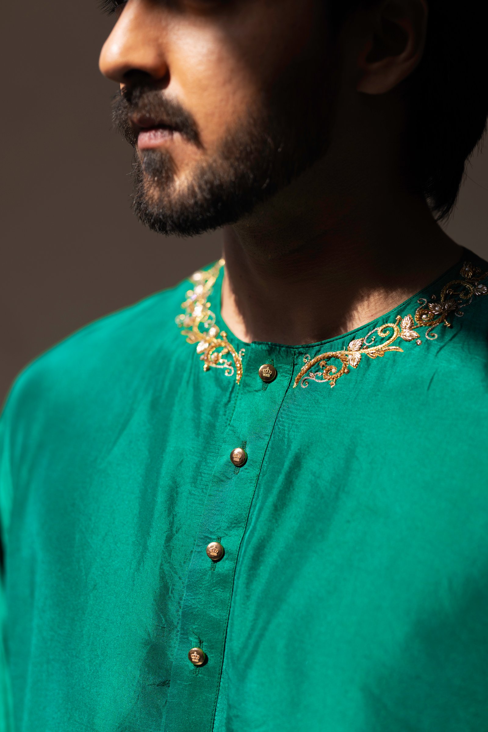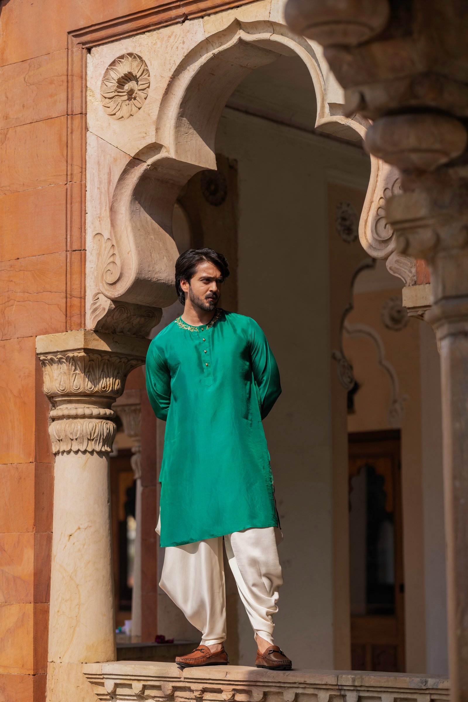 Rooted in the poetry of Mughal elegance, Shah Jahan celebrates classic menswear with a timeless feel. Crafted in a rich green kurta and paired with a slub satin dhoti bottom, Shah Jahan carries a balanced and graceful presence shaped by tradition.