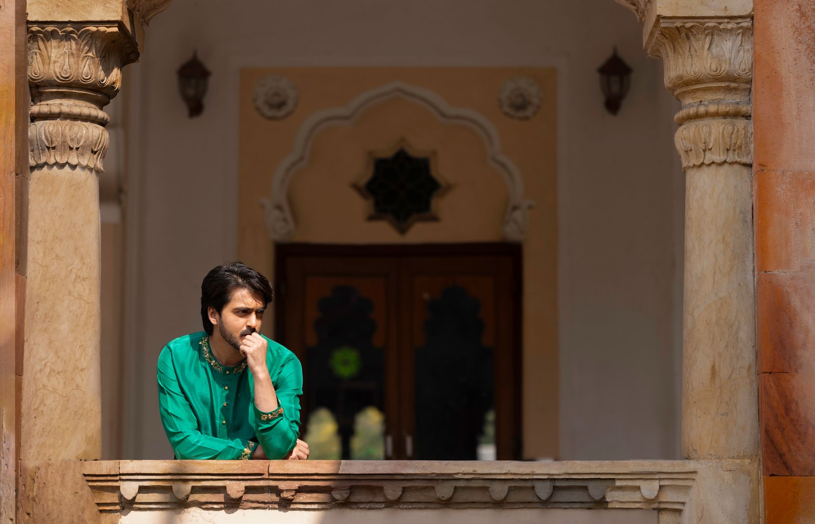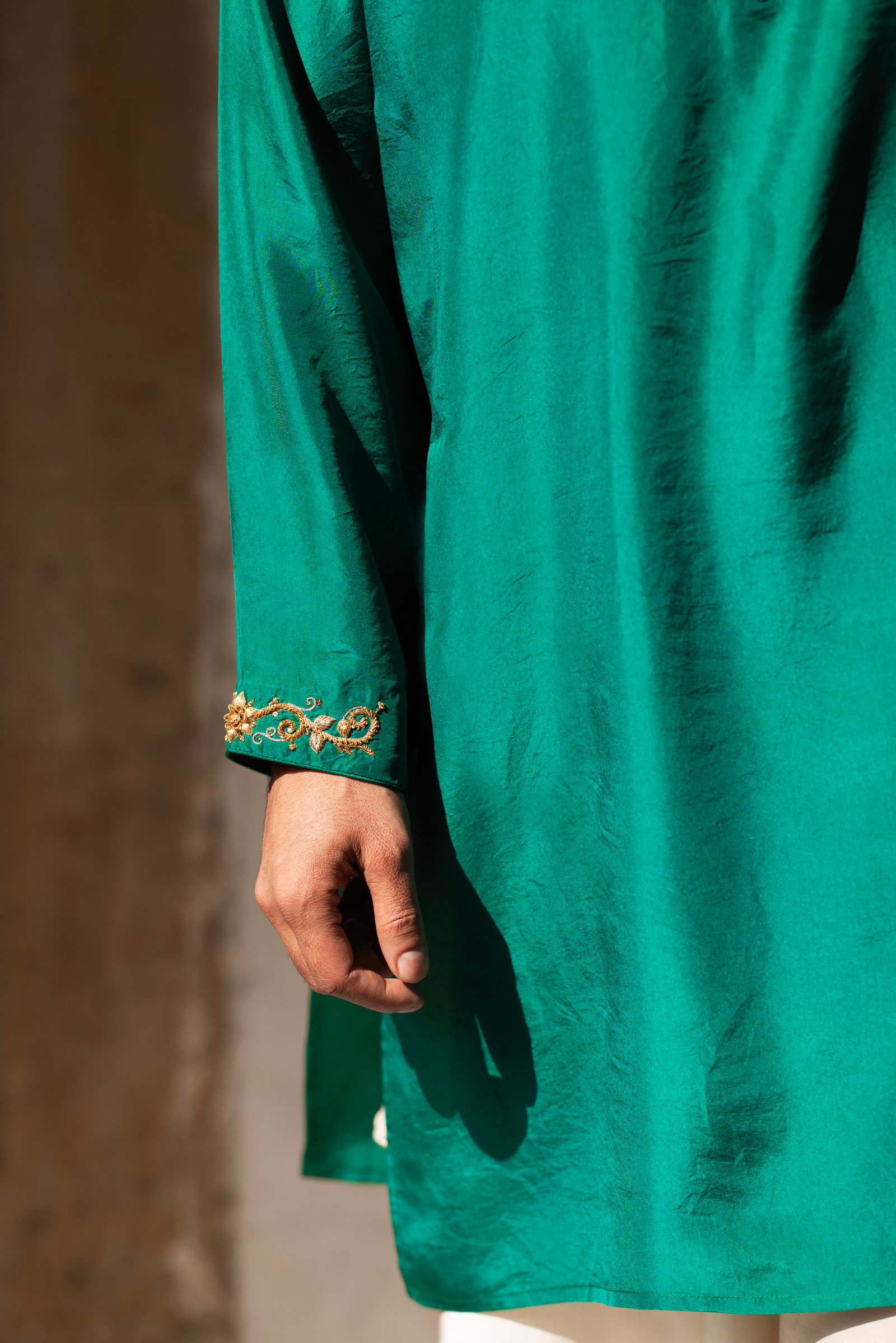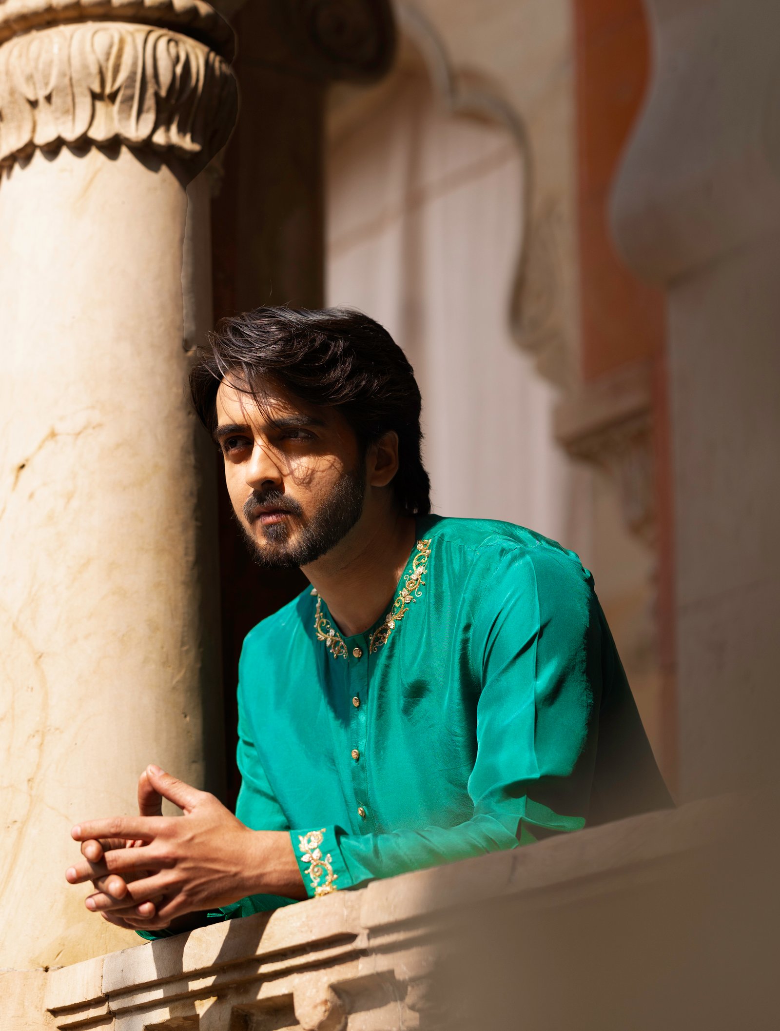 Rooted in the poetry of Mughal elegance, Shah Jahan celebrates classic menswear with a timeless feel. Crafted in a rich green kurta and paired with a slub satin dhoti bottom, Shah Jahan carries a balanced and graceful presence shaped by tradition.