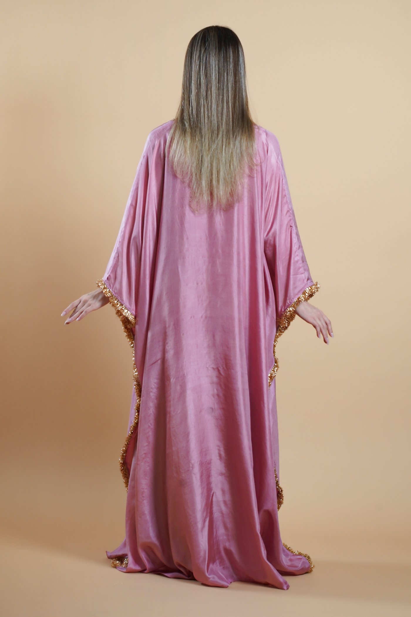 Delicate badla lace detailing runs along both sides of the kaftan, adding movement and a gentle shimmer as the fabric flows. Finished with a sense of balance and clarity, Shahbano bridges heritage and modern form where comfort meets thoughtful artistry. It is not simply worn.