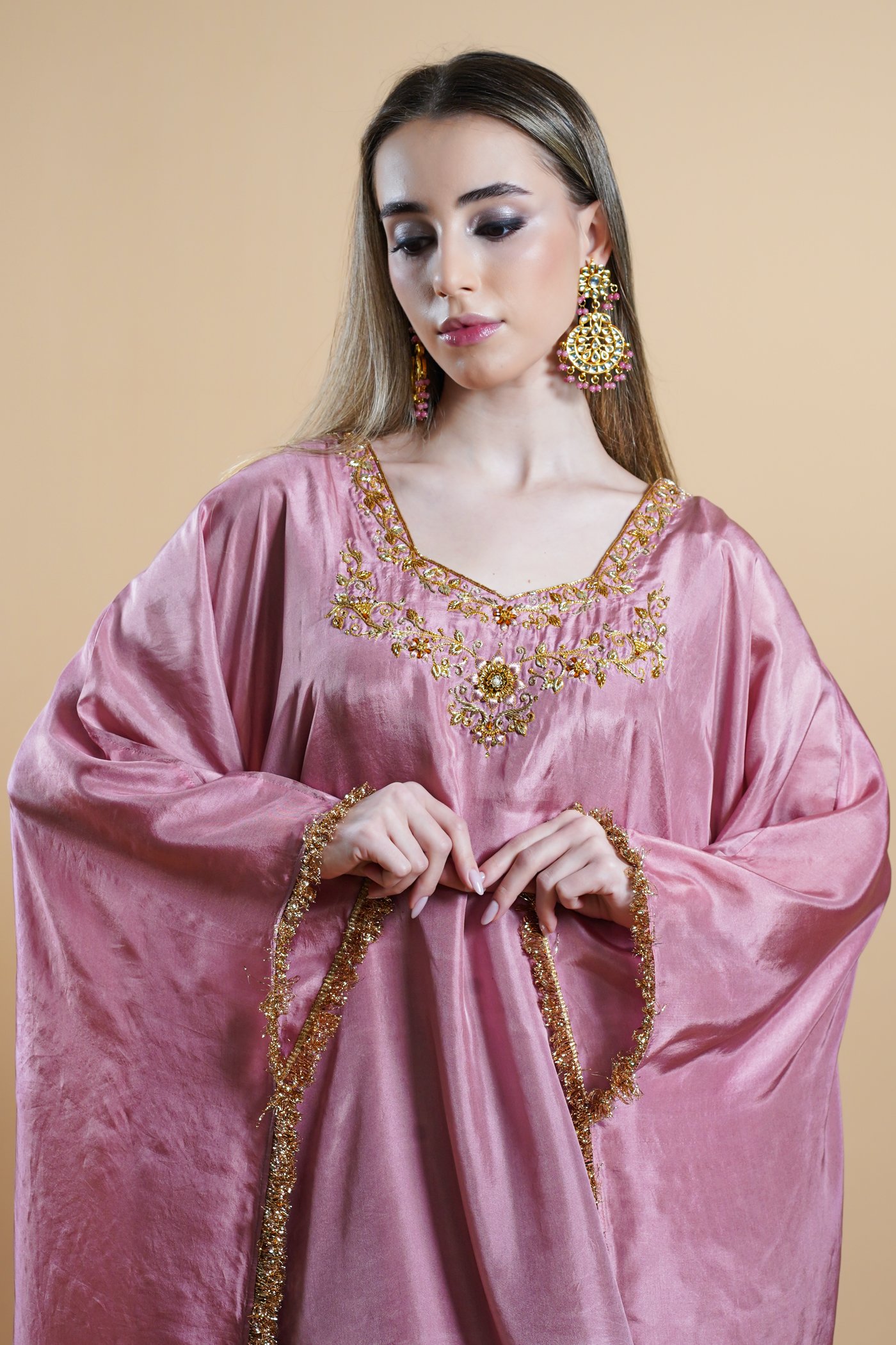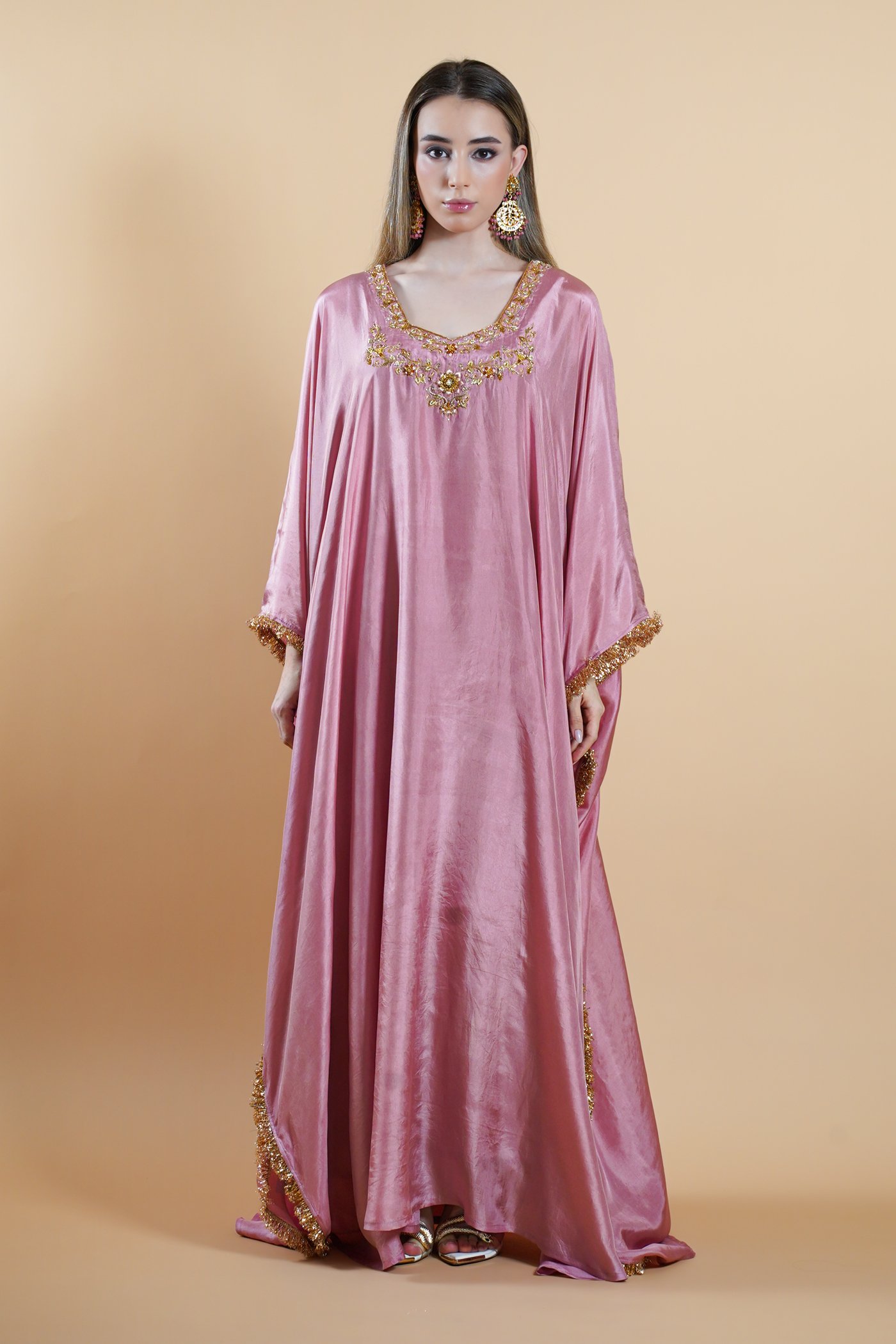 Rooted in the poetry of Mughal elegance, Shahbano is an ode to fluid beauty shaped by craftsmanship. Rendered in a soft peach tone, this kaftan falls effortlessly, creating a silhouette defined by ease and grace. The neckline features a gently scooped shape, highlighted with intricate hand done zardozi work concentrated around the neck bringing focus through refined detailing.