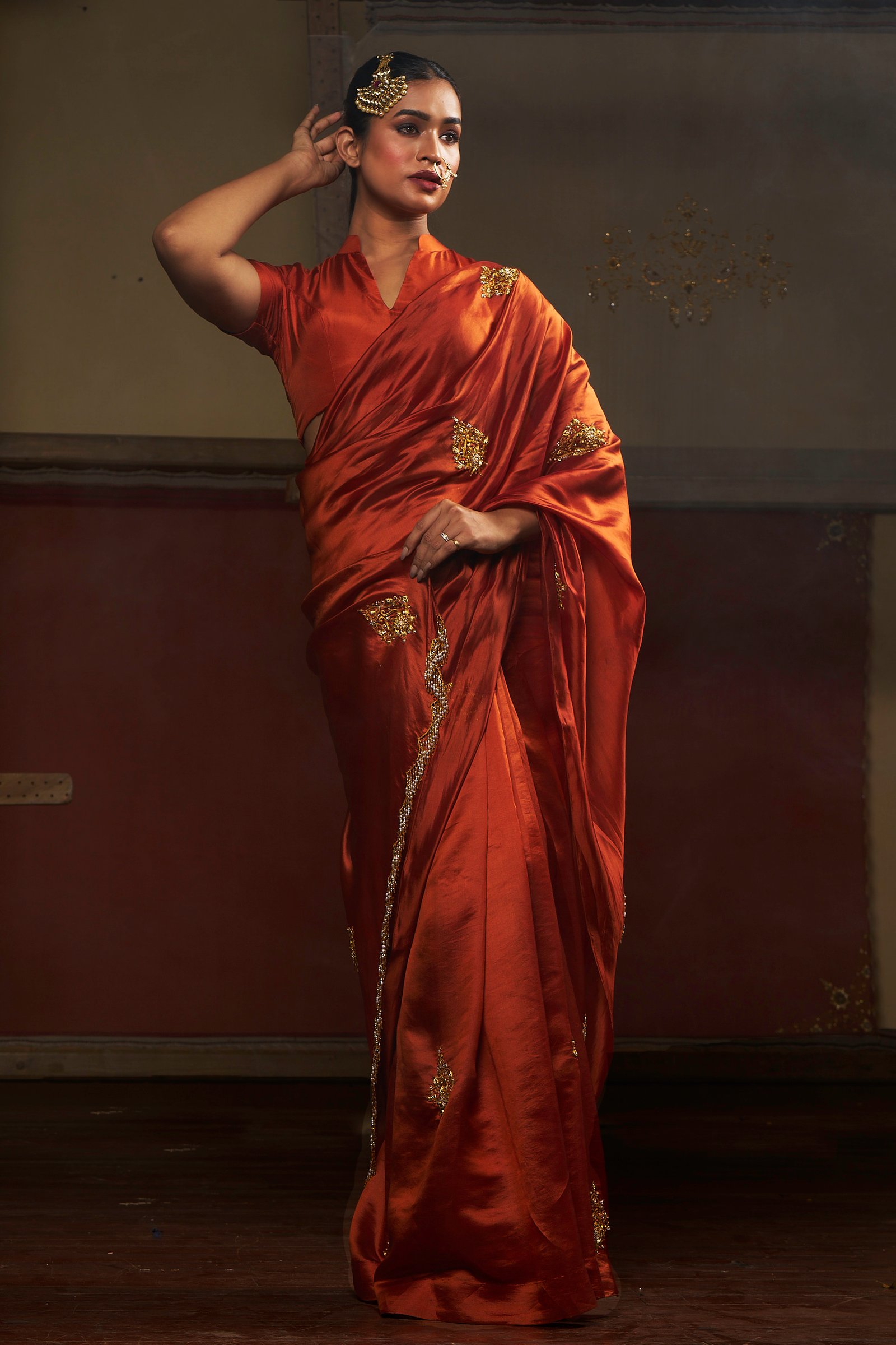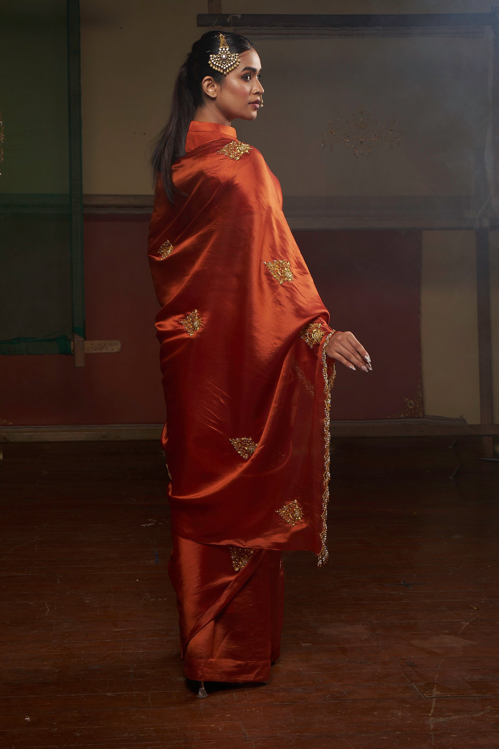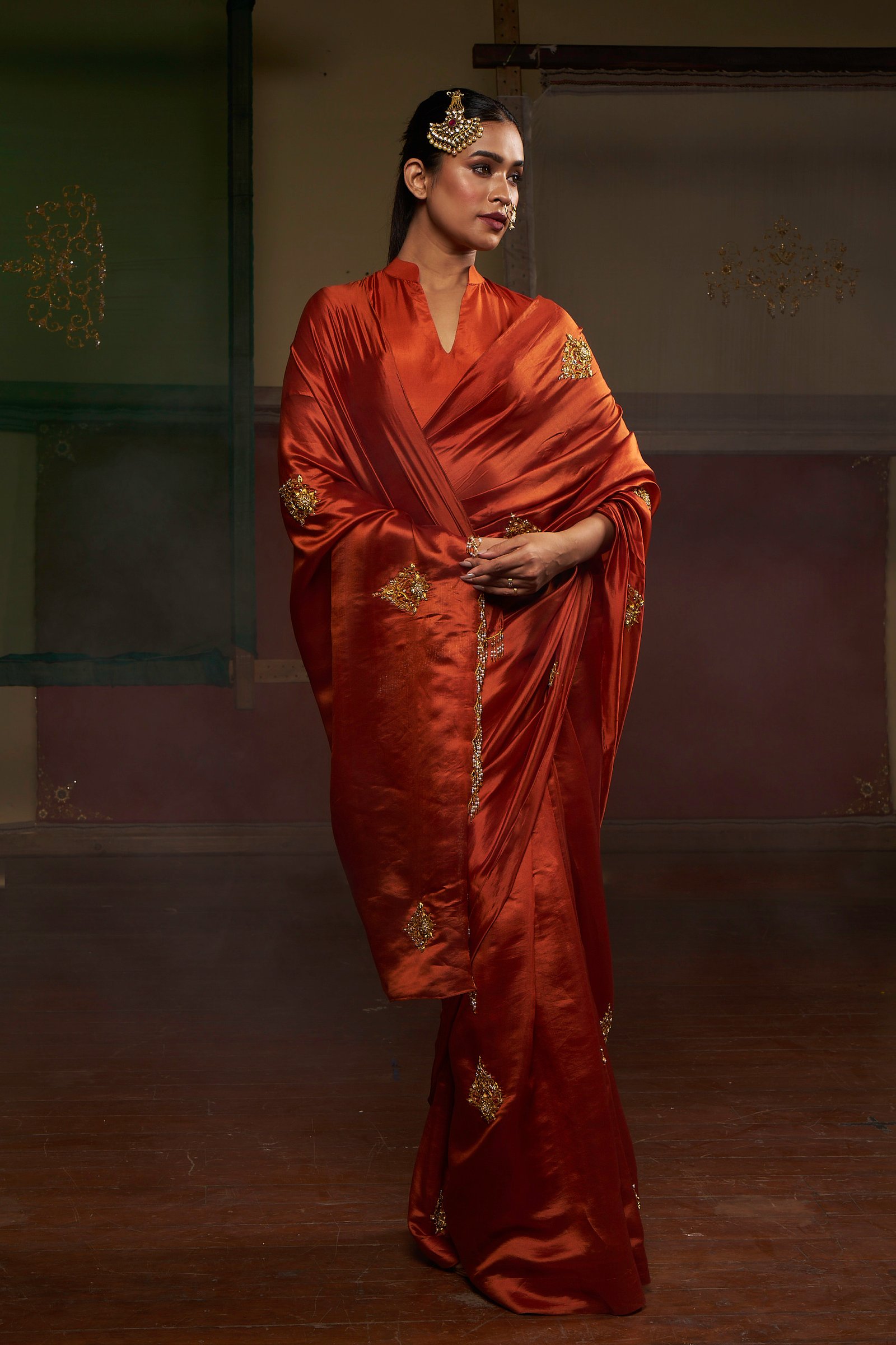 Rooted in Mughal elegance, SHAHI ADAAÂ is crafted in a warm chestnut hue, carrying a quiet richness shaped by heritage. The saree is detailed with zardozi handwork placed across the drape, allowing the surface to hold depth without overwhelming the form.