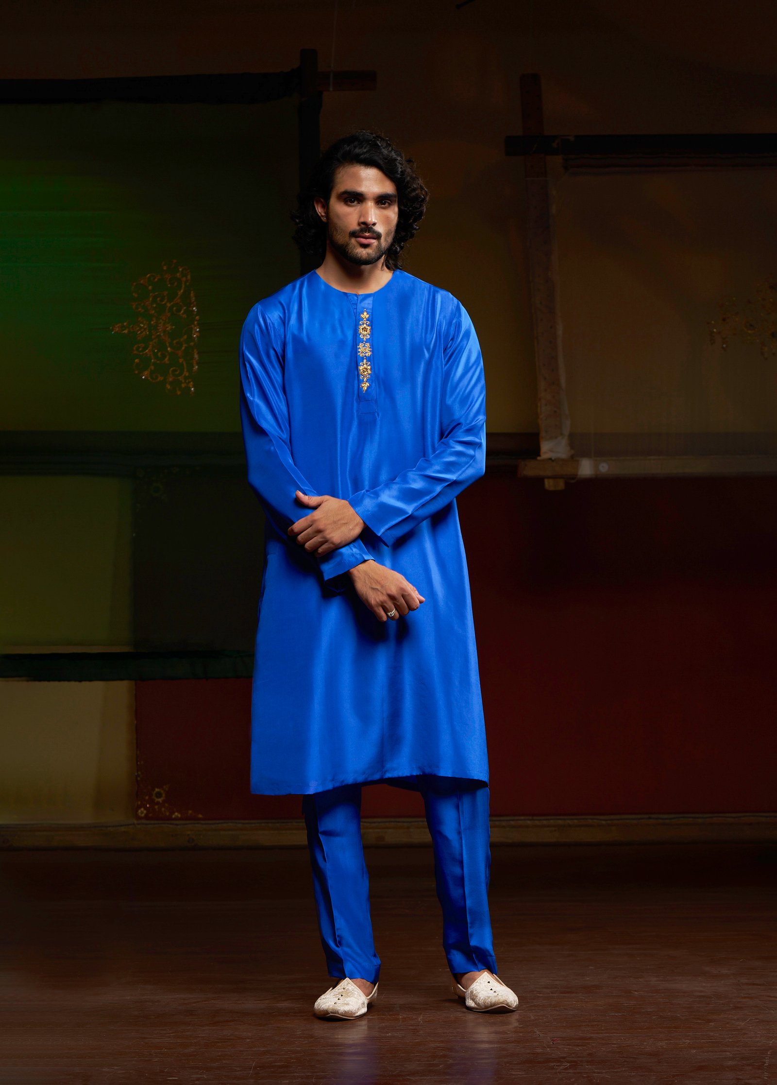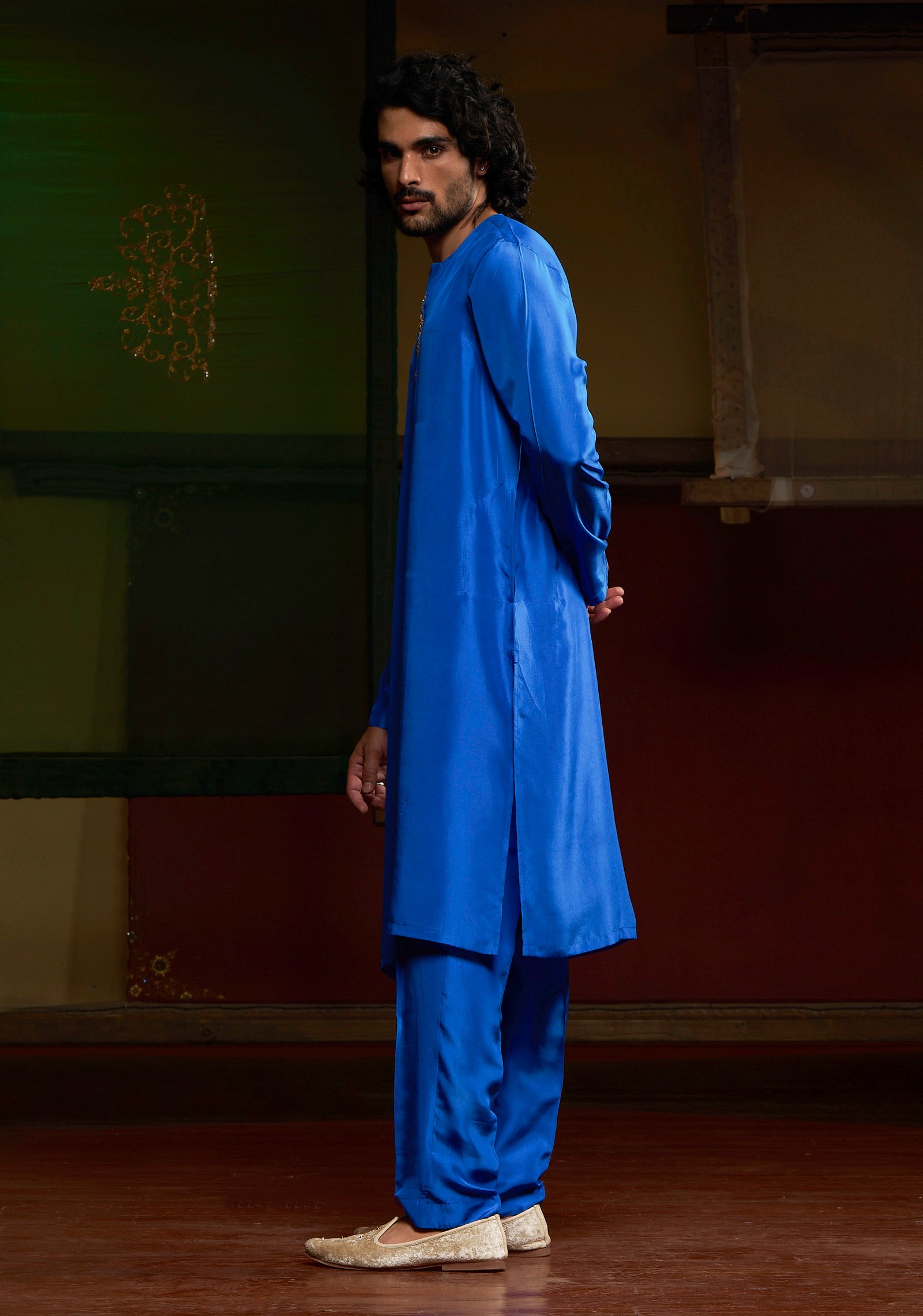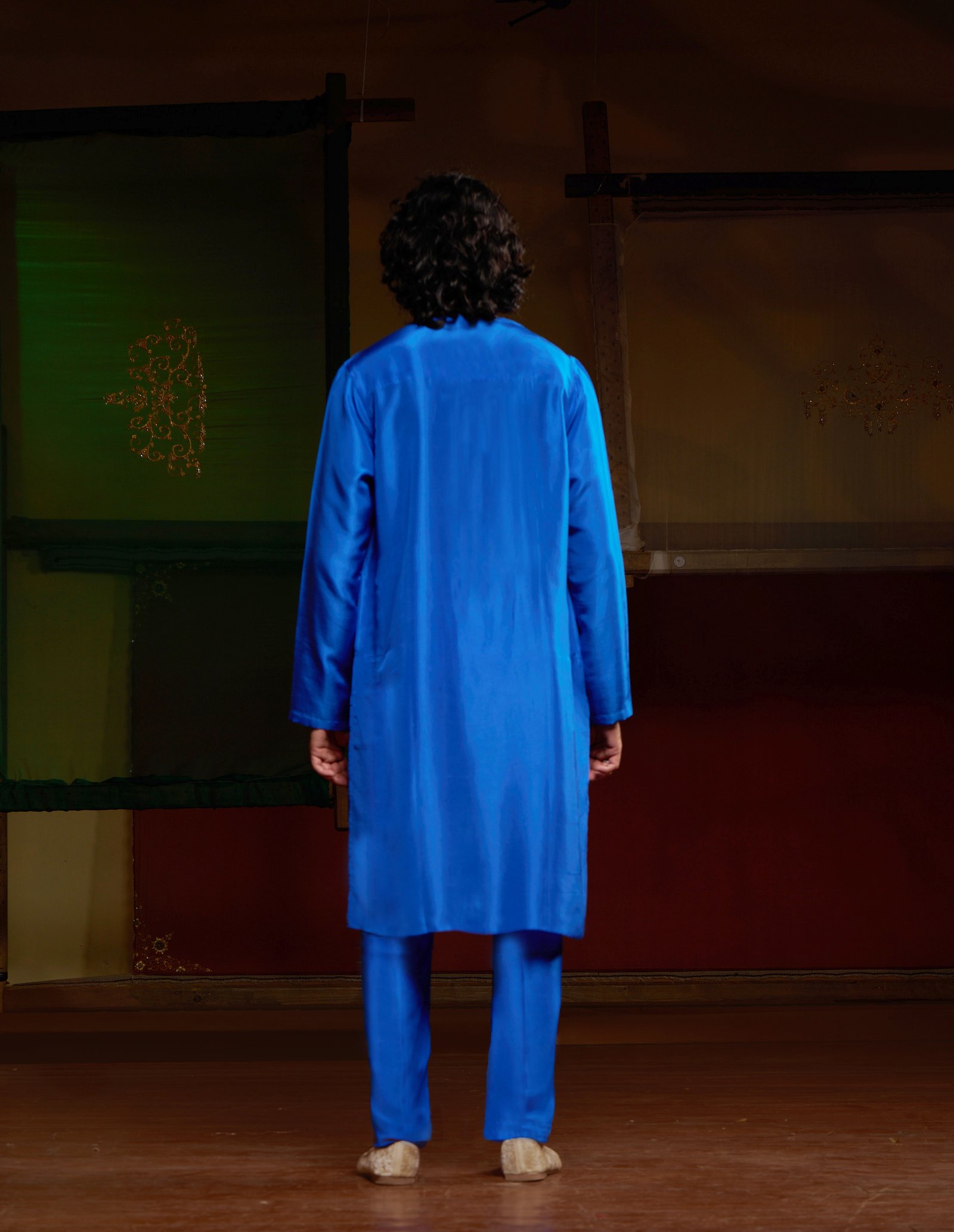 Rooted in the poetry of Mughal grandeur, Shehanshah is an expression of power shaped by heritage. Crafted in a royal blue pure silk kurta, this ensemble reflects the dignity and presence of imperial menswear. Intricate zardozi handwork adorns the placket, executed by skilled artisans whose craftsmanship has been preserved through generations, with each detail placed in quiet reverence to royal refinement.
