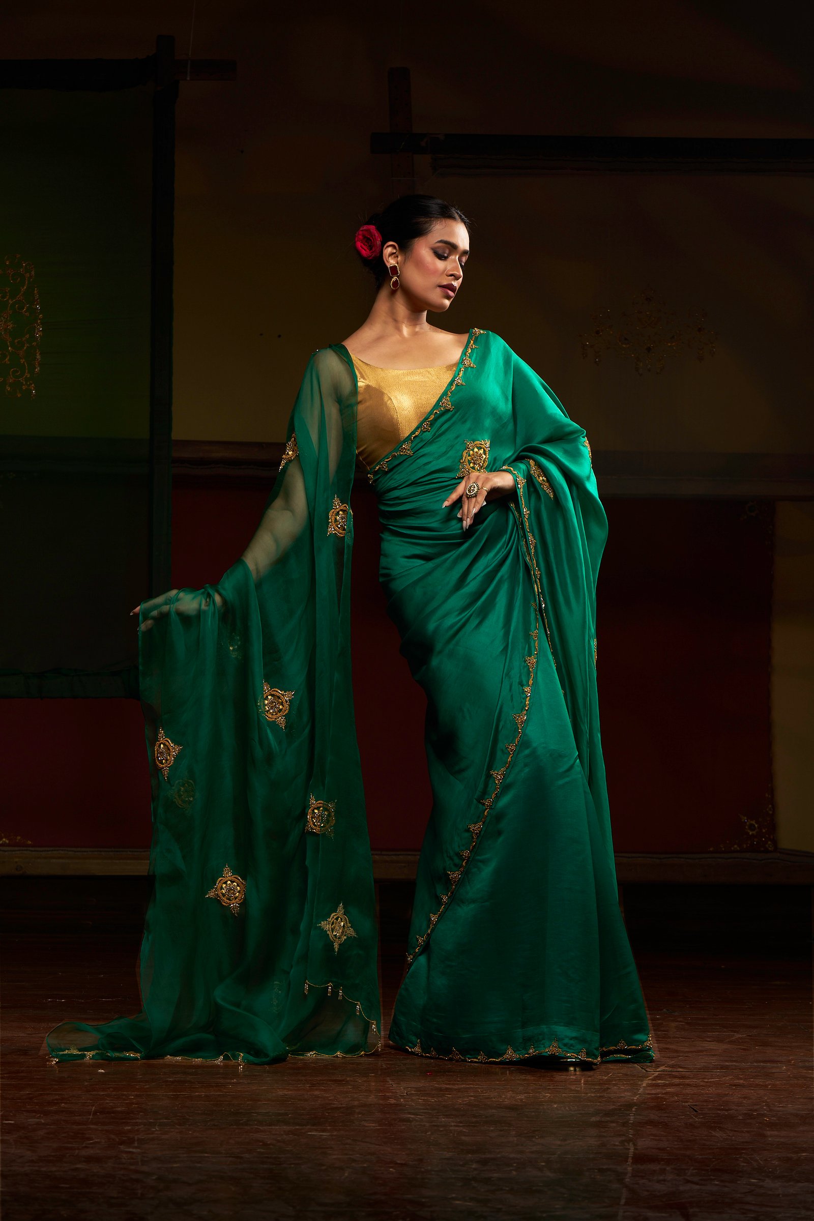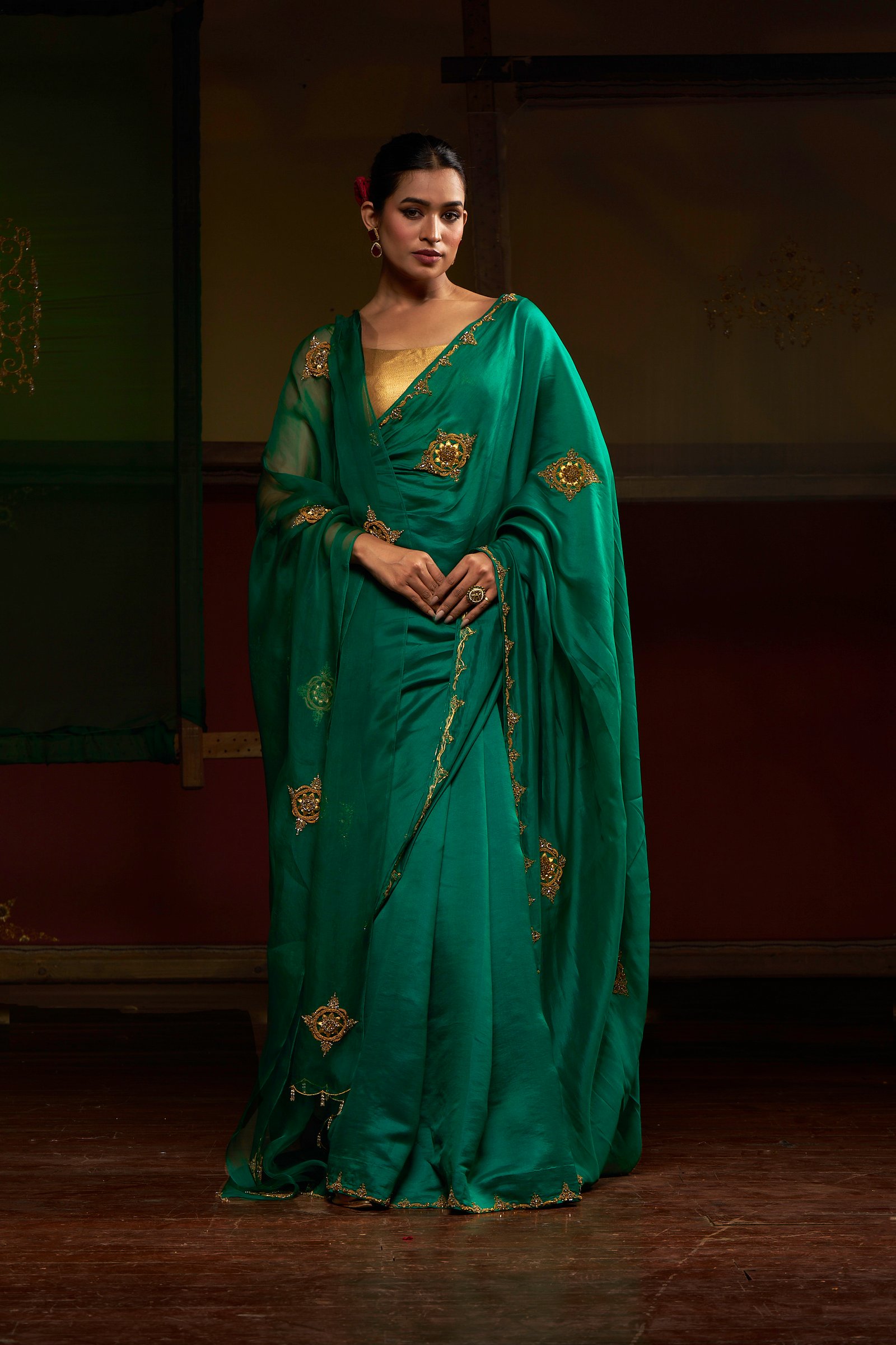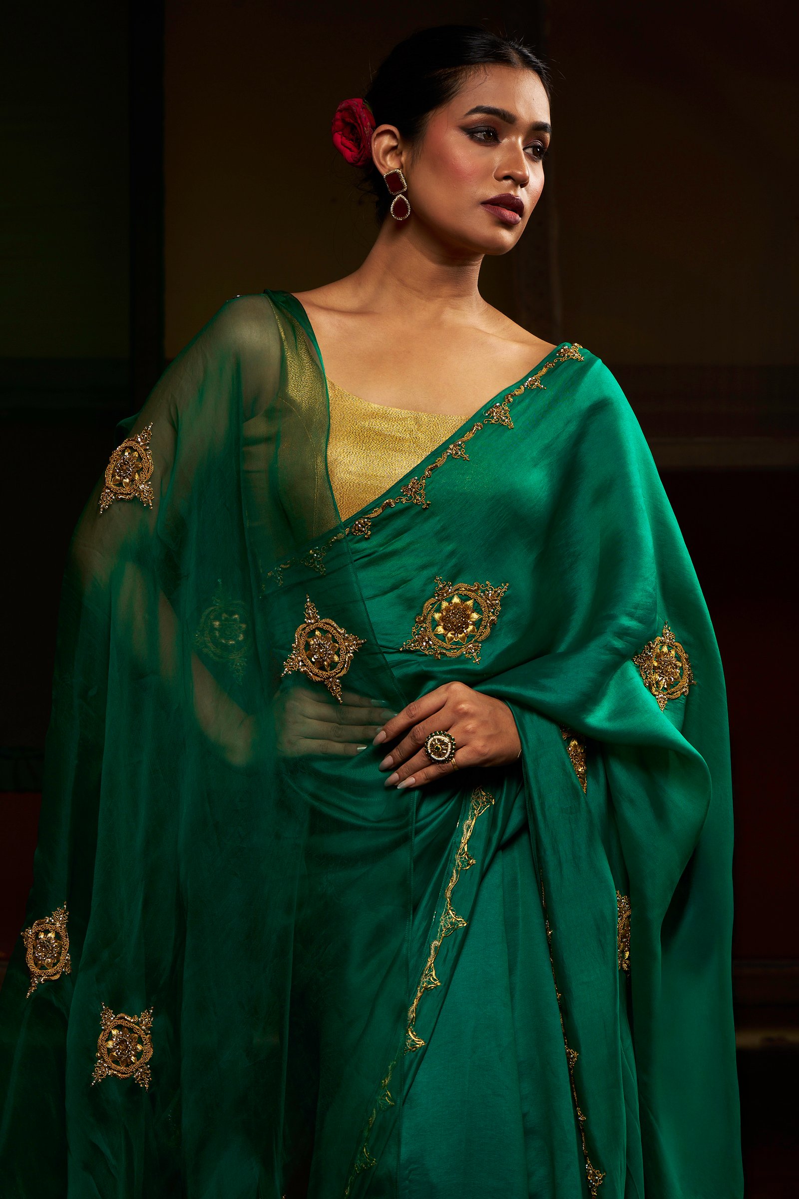 Rooted in Mughal elegance, Zar-e-Khaas reflects a form of craftsmanship where the fabric itself carries the presence of jewellery. Crafted in pure silk organza in a rich green hue, the saree features ZEWAR-inspired handwork, built with depth and dimension so the motifs feel worn on the body rather than merely embroidered onto the surface.
