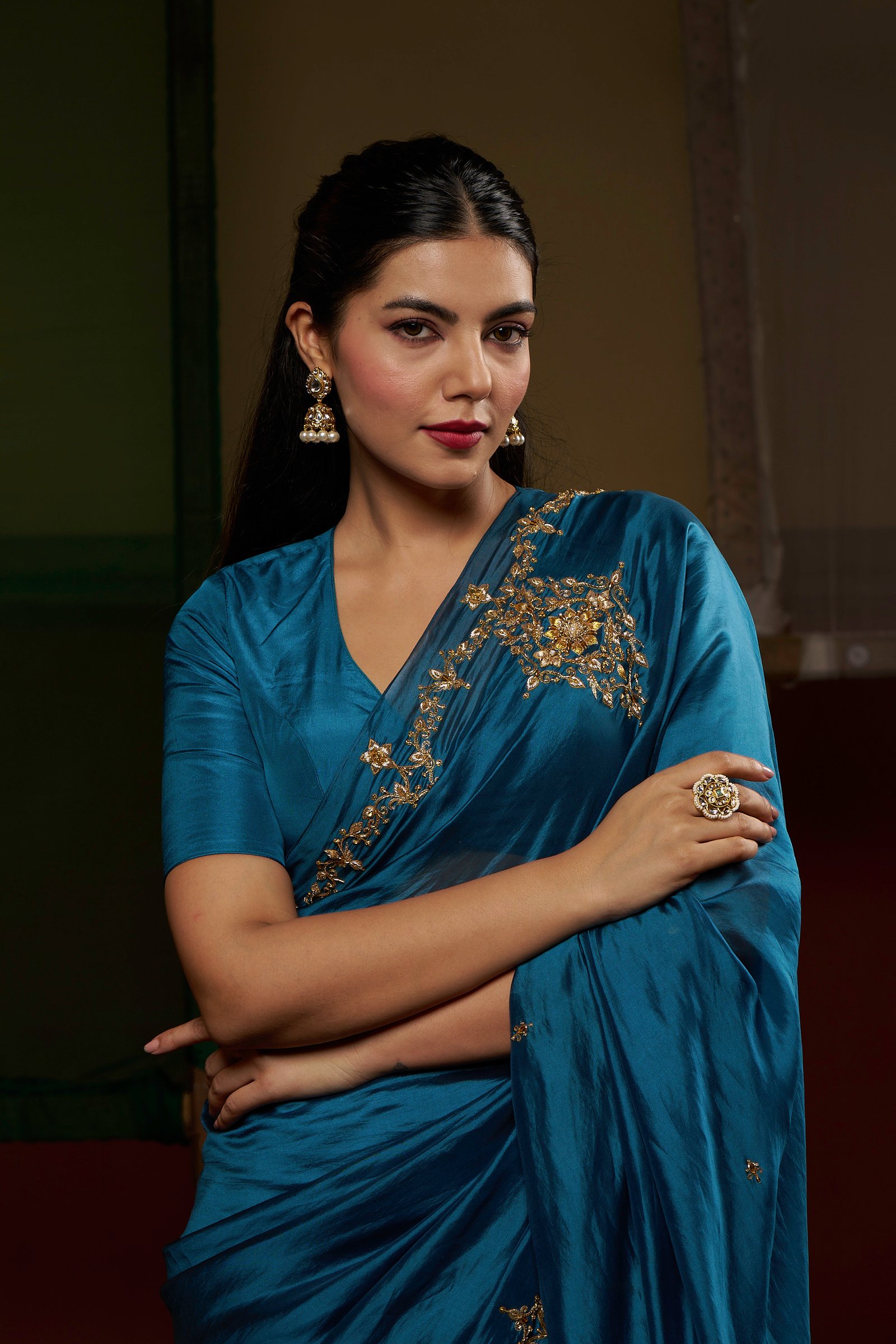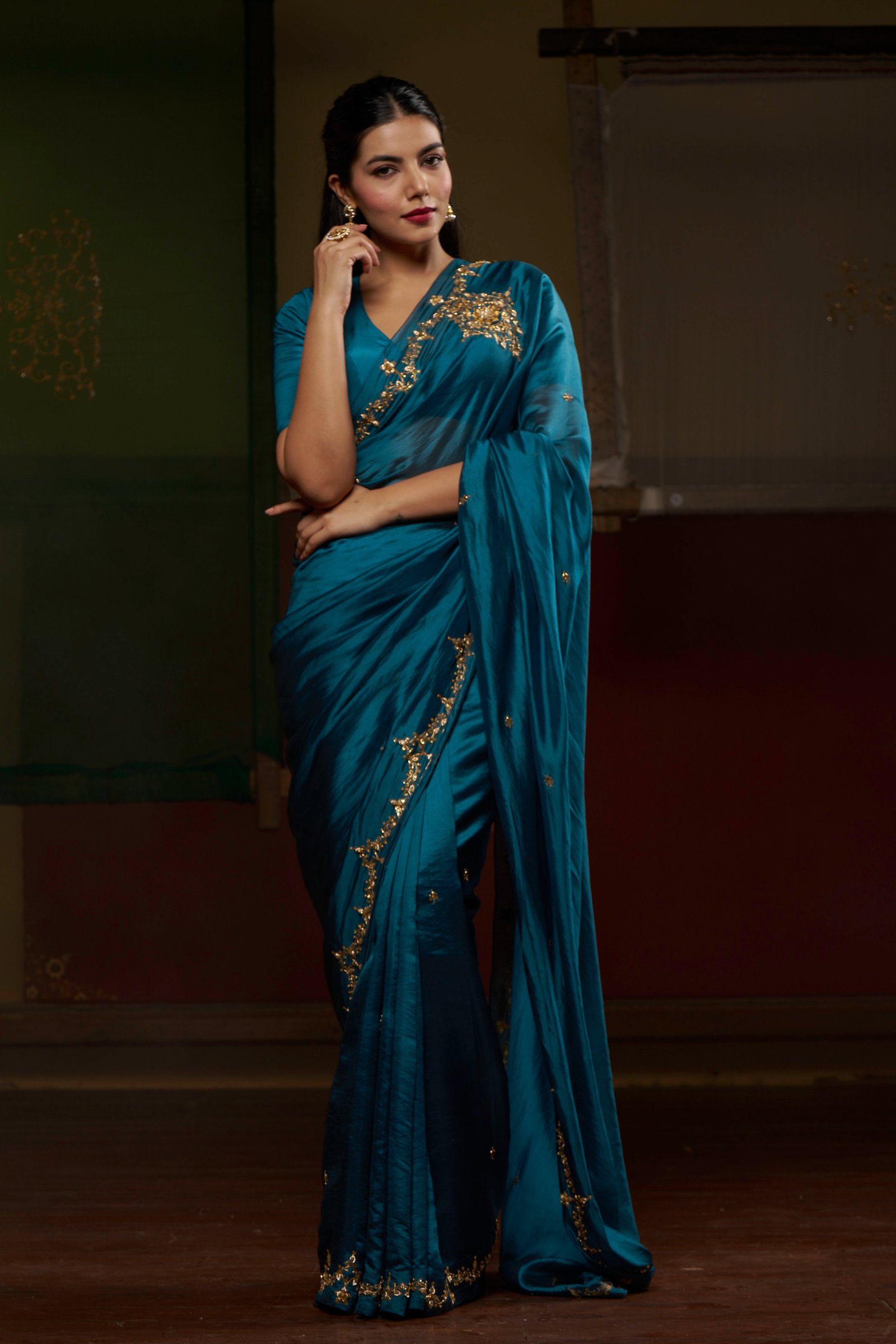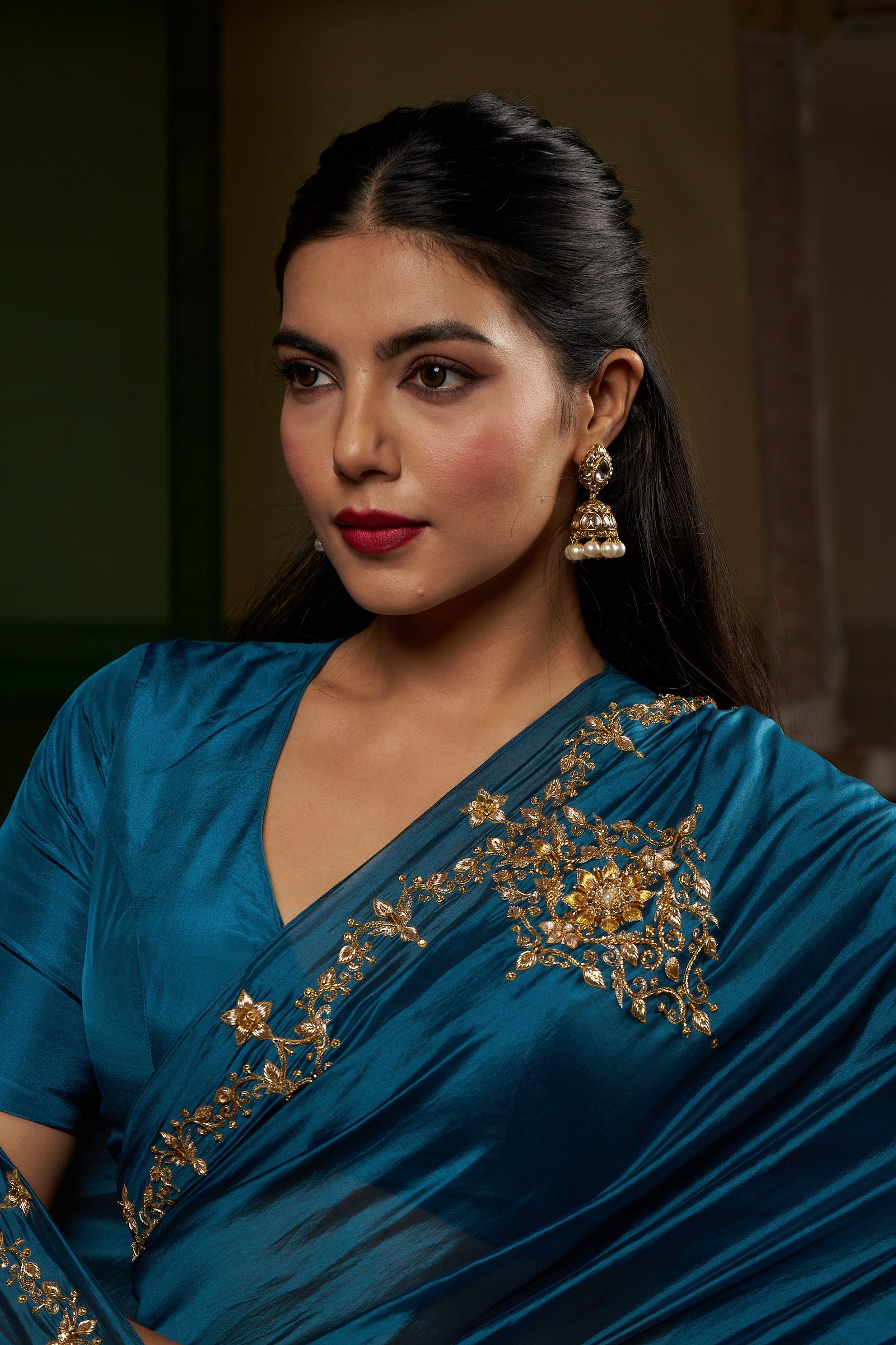 Rooted in Mughal elegance, Zari-e-Khaas is defined by precision and restraint. Crafted in a rich peacock-toned pure silk organza, the saree carries hand-applied detailing that moves fluidly across the drape, creating a composed and deliberate surface.